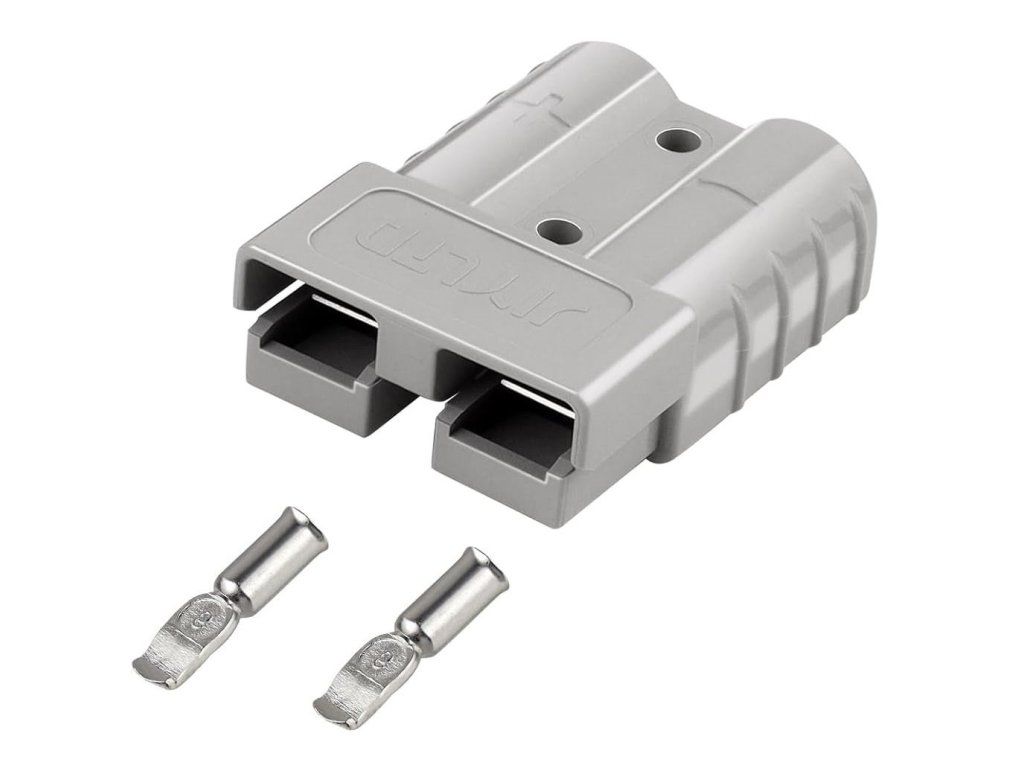 2-pole 350A power connector. Power connector specially designed for reliable connection of wires with larger cross section. The connectors can be quickly disconnected at the same time. Ideal for connecting traction and backup batteries in almost any application. Two identical, matching counterpoints are required to connect the connectors together. Simply twist the connector 180°. Product parameters: Continuous current: 350A DC voltage: 600V Contact material: Cu/Ep&Ag Flammability: UL94 V-0 Operating temperature: -20°C - +105°C Cable opening: 4.8mm Designed for cable: 25-70mm2 Dimensions: 108×70×32mm Package Contents: 1pc Anderson connector SJ-350A 600V grey 2pcs Crimp contact You need 2pcs clips to connect the appliance and battery.Additional parameters