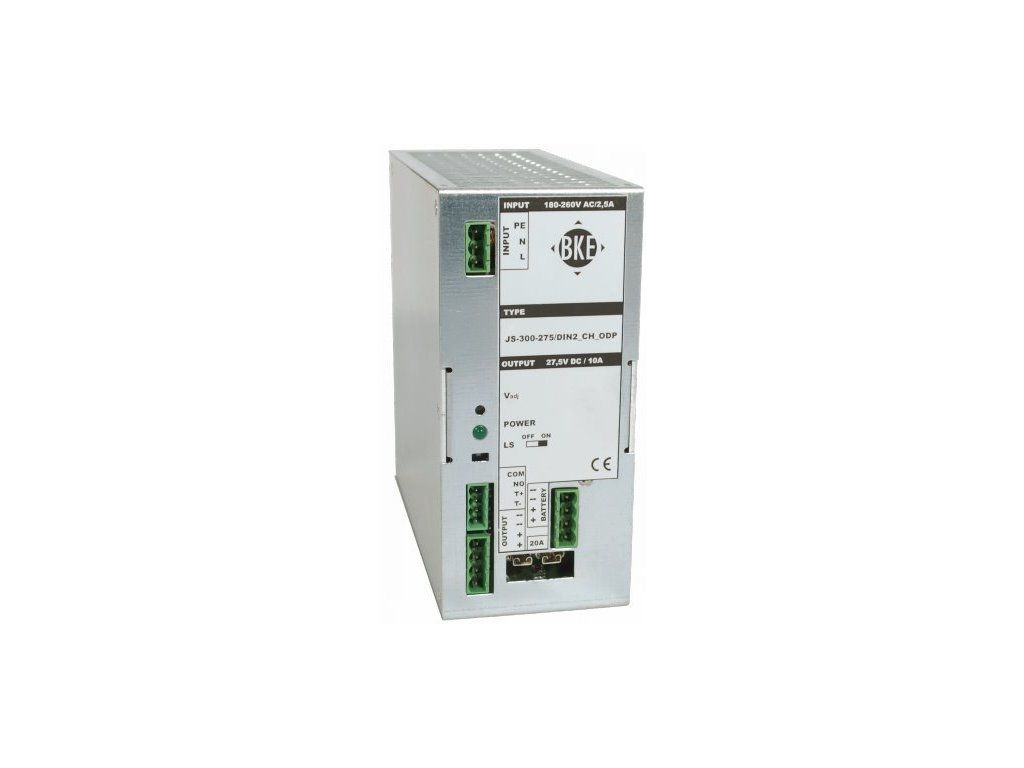 Industrial power supply/charger for Pb batteries on DIN rail BKE JS-300-545/DIN_CH_ODP 54,5 V, 300 W, 5 A, switched with battery disconnector to prevent deep discharge and damage. The power supply has short circuit and overload protection at the output, overvoltage and undervoltage protection at the output and thermal protection. The charger is equipped with active power factor compensation (PFC). The power supply is suitable for powering information and telecommunication equipment with DC voltage backup. The power supply has an efficiency of more than 80%. The power supply can be operated without a battery connected. Main features: Switching power supply Output voltage: 54.5 V DC Backup current: max. 5 A Output power: 300 W DIN35 rail mounting Input voltage: 180 - 260 V AC, 47-64 Hz, active PFC Efficiency: 80% Protection: output short circuit protection (with external battery protection), overload protection, output over-voltage and under-voltage protection, thermal protection Integrated disconnector (LVD) to protect the battery from deep discharge Charging temperature compensation Disconnection voltage: 42 V Indication LED Fanless, airflow cooling Connection via screw terminals up to 2.5 mm2, double output terminals Other parameters: Max. input current: 1.7 A/230 V AC Input protected by fusible link fuse 6.3 A/250 V Protection rating: IP20 (terminals IP00) Box material: Al sheet metal Electrical strength input-output: 3 kV AC/1 min Electrical strength input-to-ground: 1.5 kV AC/1 min Insulation resistance: >50 MOhm SELV type output circuits Output with isolation dida Automatic battery connection when output voltage is restored IU characteristics with current limiting The power supply is designed as protection class I, overvoltage category 3 in installation according to EN 61010-1 Standards: Safety: EN 60950-1 ed.2 EMC: EN 61000-6-1 ed.2, EN 61000-6-3 ed.2 Working conditions: Temperature: 0° to +40°C Humidity: relative 10 to 80% (non-condensing) Dimensions: 75 x 155 x 175 mm (without clip) Weight: 1.4 kgAdditional parameters