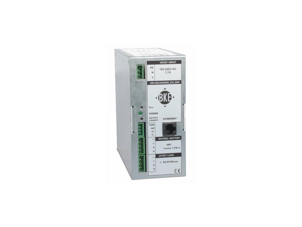 BKE JSD-300-545/DIN2_CH_ODP 54.5 V, 300 W, 5 A, switched with battery disconnector to prevent deep discharge and damage. The power supply is equipped with remote management via SNMP or web interface allowing to manage the power supply and send alarms when the set parameters are exceeded. It is possible to remotely disconnect the output voltage for a short period of time to ensure the restart of connected devices. The power supply has protection against short circuit and overload at the output, overvoltage and undervoltage at the output and thermal protection. The charger is equipped with active power factor compensation (PFC). The power supply is suitable for powering information and telecommunication equipment with DC voltage backup. The power supply has an efficiency of more than 85%. The power supply can be operated without a battery connected.