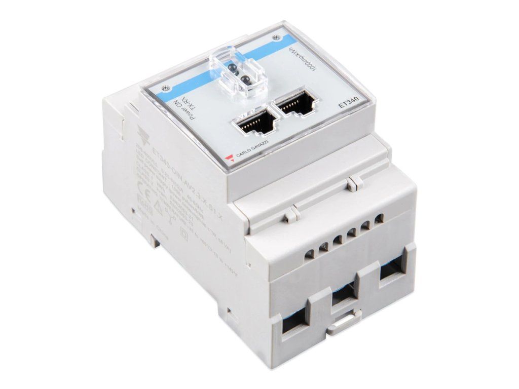 The meter is designed to measure the power and energy of an entire application in a junction box or to measure the output power of a PV inverter and display the data on the Color Control GX and VRM portal ET340 Three-phase energy converter (for three phases, max. 65 A) Direct connection either via RS485 to USB interface with 1.8 m cable length or 5.0 m cable length. Wireless connection via Zigbee. Product parameters: Product code: ET340DINAV23XS1X Voltage inputs: 3-phase (3-wire), 240 V L-L; 3-phase (3-wire), 380 V L-L; 3-phase (3-wire), 400 V L-L; 3-phase (3-wire), 415 V L-L Frequency: 50 Hz, 60 Hz Energy measurement: Power and energy measurement Power source: Self-powered Weight: 0.2kg Class 1 (kWh) according to EN62053-21 Accuracy ±0.5% RDG (current/voltage) DC current measurement up to 65AAC Energy measurement: kWh and kvarh (import/export); kWh+ by 2 tariffs; kWh per phase System variables: kW, kvar, kVA, VLL, VLN, PF, Hz, kWdmd, kWdmd peak Phase variables: kW, kvar, kVA, VLL, VLN, A, PF Dimensions: 3-DIN module Degree of protection (front): IP20 RS485 Modbus port (optional) Digital input (for tariff management)Additional parameters