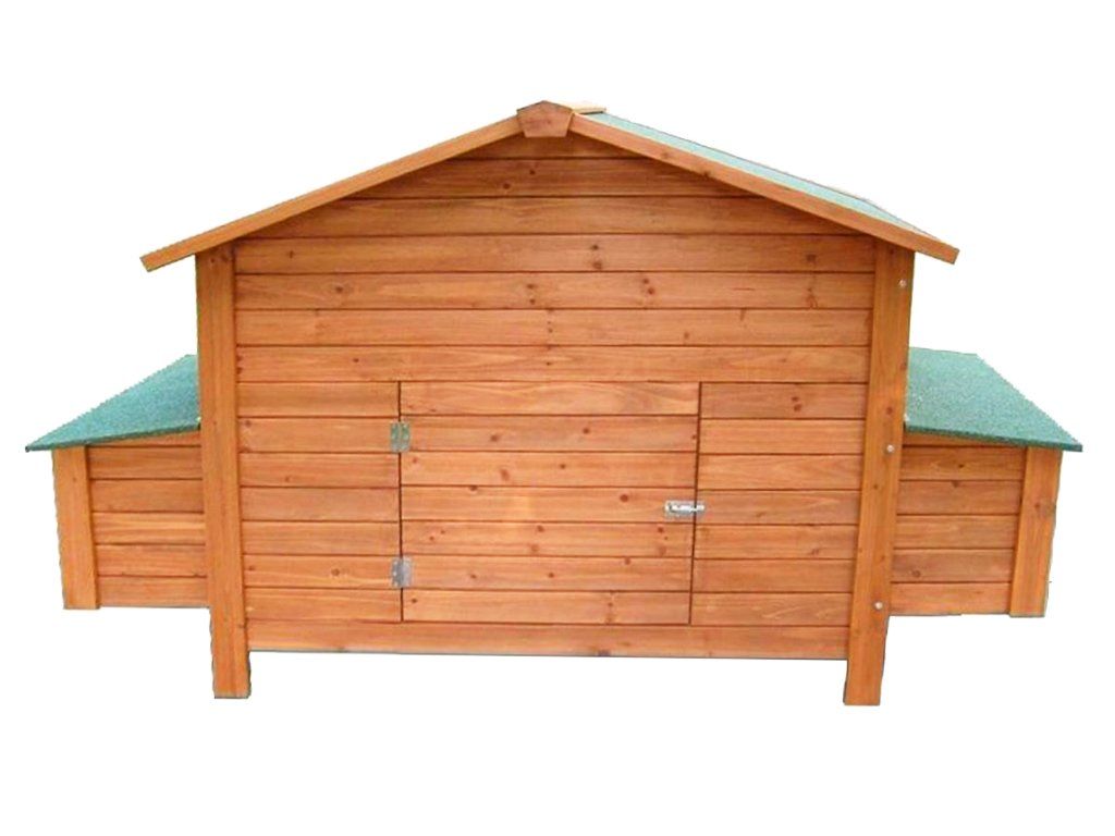 Kurinmade of pine wood has a massapprox. 40 kg, thus ensuring great stability. For efficientfloor ventilation is placedon four raised legs. Despitethe absence of insulation the laying hens remain under the roof of the hen house and in the laying nestsprotected by asphalt covering, which representsmeasure against sunlight. However, we recommend placing the chicken coop under some kind of shelter to protect it from the elements, including rain, snow and sunlight. A wooden fireplace issurface treated with a protective primer. As with all wood, the protective coating needs to be renewed for longer life.Air circulation in the henhouse ensuresfront hinged window.
