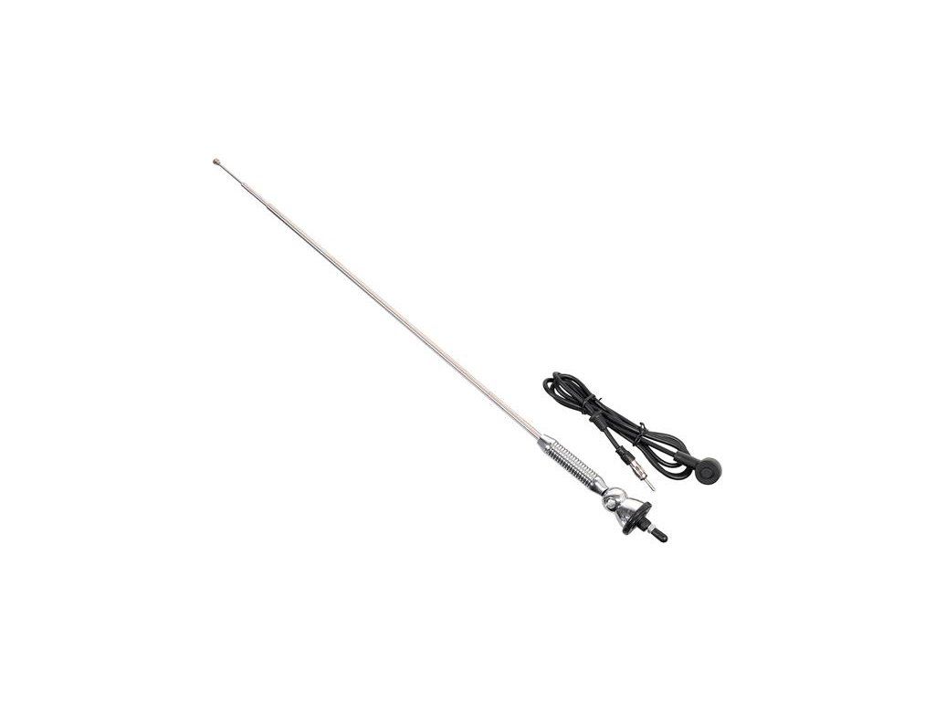 Telescopic car antenna for radio signal reception in the car, composed of telescopic screw rod, mounting socket with joint and supply cable.