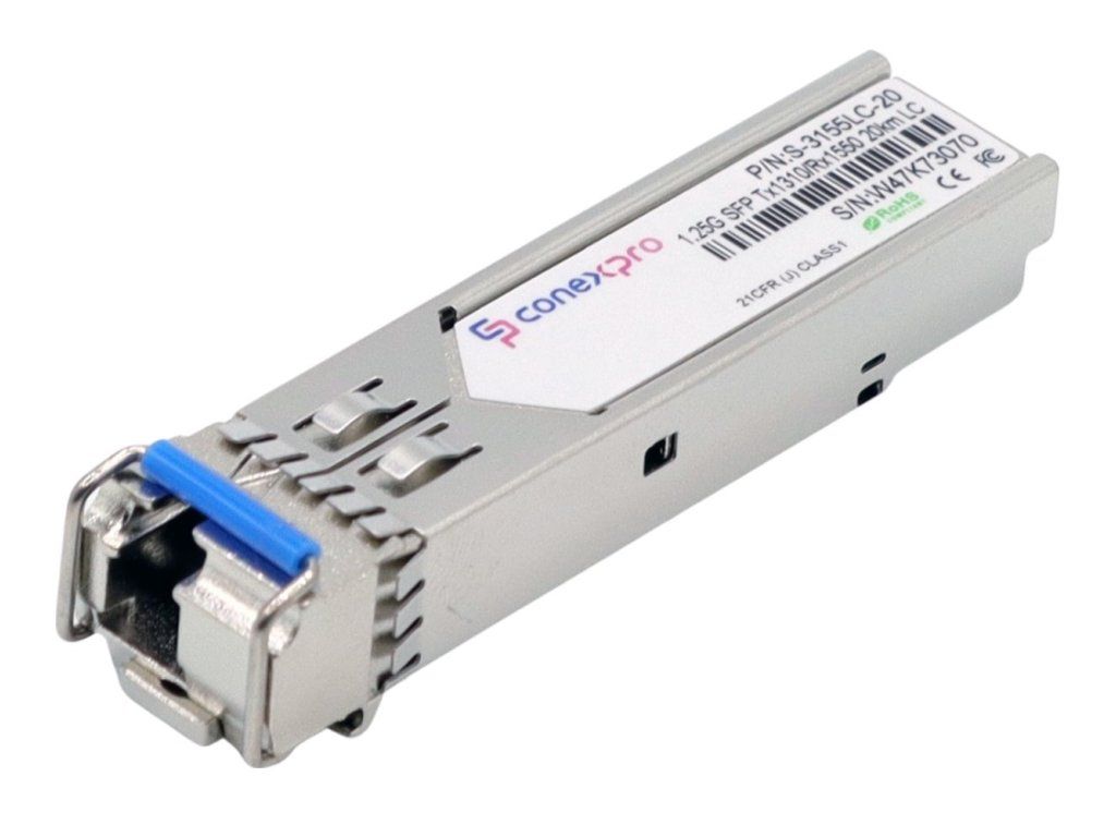 Gigabit WDM/Bidi Singlemode SFP module from Conexpro with a wavelength (Tx/Rx) of 1310/1550nm, speed of 1 Gbps, equipped with one LC connector with UPC grinding and is designed for connections up to 20 km. This module provides universal compatibility, meaning it is capable of working with almost all available active elements. Of course, it supports optical link diagnostics using the DDM (Digital Diagnostic Monitoring) function. For proper functionality of the optical link, it is necessary to have an SFP module with opposite wavelengths (Tx = 1550nm, Rx = 1310nm) on the opposite side of the optical path.Additional parameters