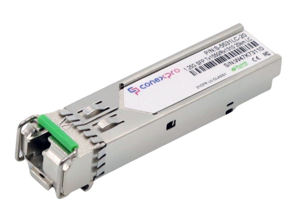 Gigabit WDM/Bidi Singlemode SFP module from Conexpro with a wavelength (Tx/Rx) of 1550/1310nm, speed of 1 Gbps, equipped with one LC connector with UPC grinding and is designed for connection over a distance of 20 km. This module provides universal compatibility, meaning it is capable of working with almost all available active elements. Of course, it supports optical link diagnostics using the DDM (Digital Diagnostic Monitoring) function. For proper functionality of the optical link, it is necessary to have an SFP module with opposite wavelengths (Tx = 1310nm, Rx = 1550nm) on the opposite side of the optical path.Additional parameters