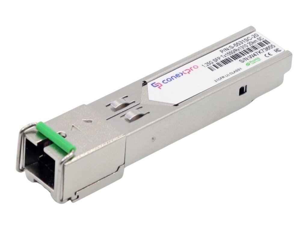 Gigabit WDM/Bidi Singlemode SFP module from Conexpro with a wavelength (Tx/Rx) of 1550/1310nm, speed of 1 Gbps, equipped with one SC connector with UPC grinding and is designed for connection over a distance of 20 km. This module provides universal compatibility, which means it is able to work with almost all available active elements. Of course, it supports optical link diagnostics using the DDM (Digital Diagnostic Monitoring) function. For proper functionality of the optical link, it is necessary to have an SFP module with opposite wavelengths (Tx = 1310nm, Rx = 1550nm) on the opposite side of the optical path.Additional parameters