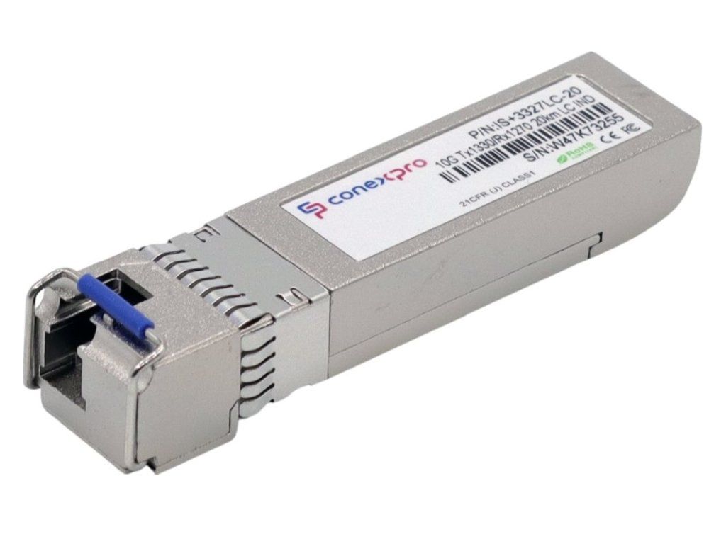 10-Gigabit WDM/Bidi Singlemode SFP+ module from Conexpro with a wavelength (Tx/Rx) of 1330/1270nm, speed of 10 Gbps, equipped with one LC connector with UPC grinding and is designed for connections up to 20 km. This module provides universal compatibility, meaning it is capable of working with almost all available active elements. Of course, it supports optical link diagnostics using the DDM (Digital Diagnostic Monitoring) function. The module in its industrial version differs from the standard version with higher quality components and an extended operating temperature range from -45°C to +85°C. For proper functionality of the optical link, it is necessary to have an SFP+ module with opposite wavelengths (Tx = 1270nm, Rx = 1330nm) on the opposite side of the optical path.Additional parameters