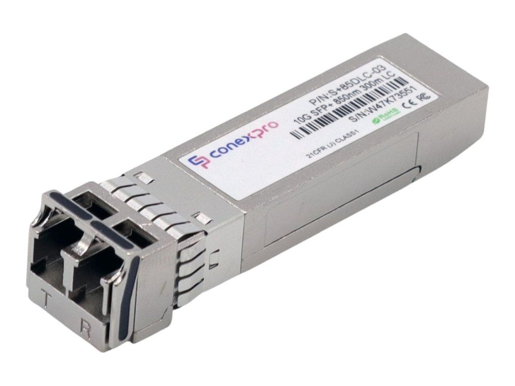 Gigabit MultiMode SFP+ module from Conexpro with a wavelength (Tx and Rx) of 850nm, speed of 10 Gbps is equipped with two LC connectors and is designed for connections up to 300m. This module provides universal compatibility, which means that it is able to work with almost all available active elements. Of course, it supports optical link diagnostics using the DDM (Digital Diagnostic Monitoring) function.Additional parameters