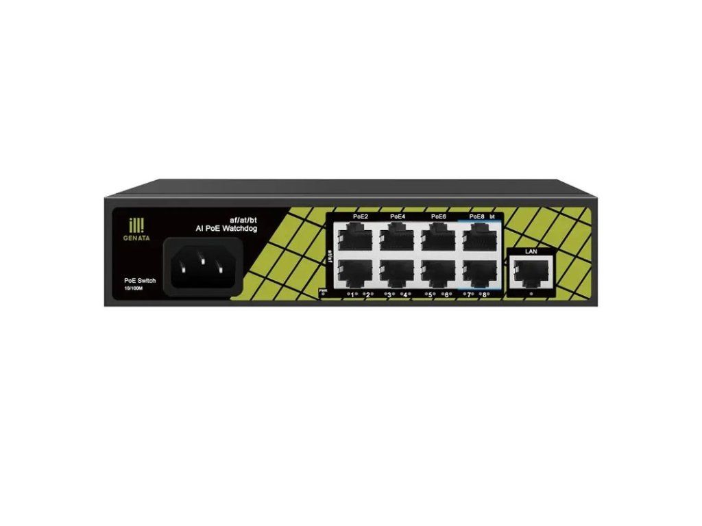 Fast Ethernet metal PoE switch without management with one uplink port is an ideal PoE switch for homes and family houses to power up to 8 devices (cameras/Wi-Fi AP) with low power consumption. The switch offers silent fanless operation, 9x 10/100 Mbps LAN of which 8 Ethernet ports support PoE function (802.3af/at, 30W/port, ports 7 and 8 also support 802.3af/at/bt - 60W/port) with a total PoE budget of 120W, low internal power consumption and powered via 230V AC connector thanks to the built-in power supply. The switch can power devices up to a distance of 250m while reducing the line rate to 10 Mbps. Key Features - (9) 10/100 Mbps LAN - 230V AC power supply - (6) 802.3af/at PoE (30W/port) + (2) 802.3af/at/bt PoE (60W/port) - PoE budget 120W - Long range support - range up to 250m - Rugged metal chassis - Quiet operation without fans - PoE watchdog - Dimensions 187 x 139 x 43mm Package contents - Device - Power cableAdditional parameters
