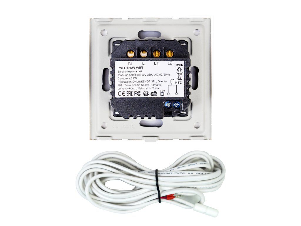 Čidlo teploty podlahy - Inteligentní termostat PNI CT26W obsahuje dvě čidla: jedno zabudované pro vzduch a externí kabelové čidlo, které detekuje a přenáší do centrální jednotky teplotu na úrovni podlahy. Výchozí teplota zobrazená na obrazovce je teplota vzduchu v místnosti.