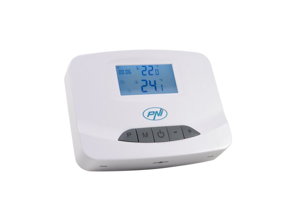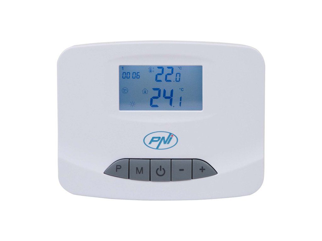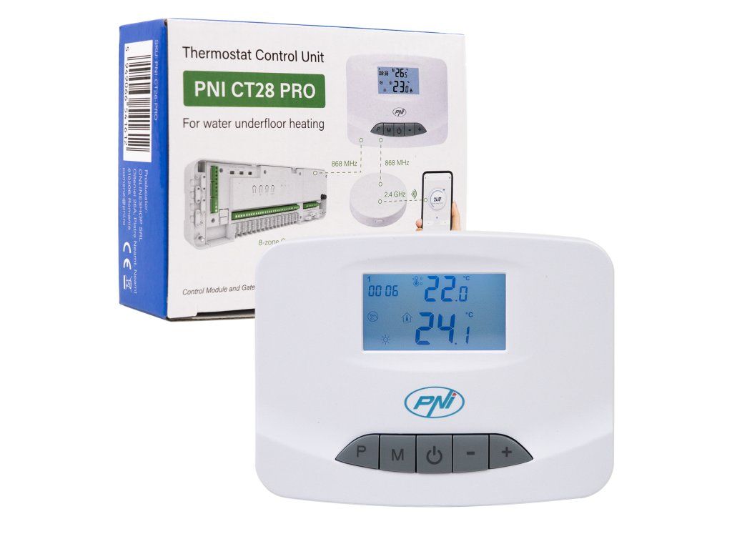 - PNI CT28 PRO je termostat, který zobrazuje teplotu a umožňuje denní programování (4 období/den), změny režimů (Manuální, Eco, Naplánovaný) a lze jej ovládat lokálně nebo prostřednictvím aplikace po spárování s Wi-Fi rozbočovačem. Podporuje užitečné funkce jako ochrana proti mrazu, zámek klávesnice (dětská pojistka), detekce otevřeného okna (open window) a kalibrace teploty.