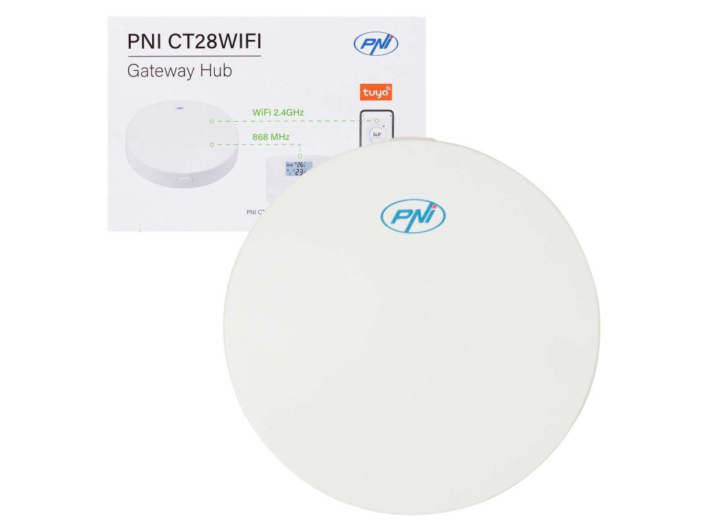 - PNI CT28WIFI připojuje celý systém k internetu, což umožňuje vzdálené ovládání přes Tuya Smart. Rozbočovač překládá mezi Wi-Fi a rádiovým signálem (868 MHz), takže CT28 PRO a CT28M mohou být připojeny k síti a ovládány z vašeho telefonu.