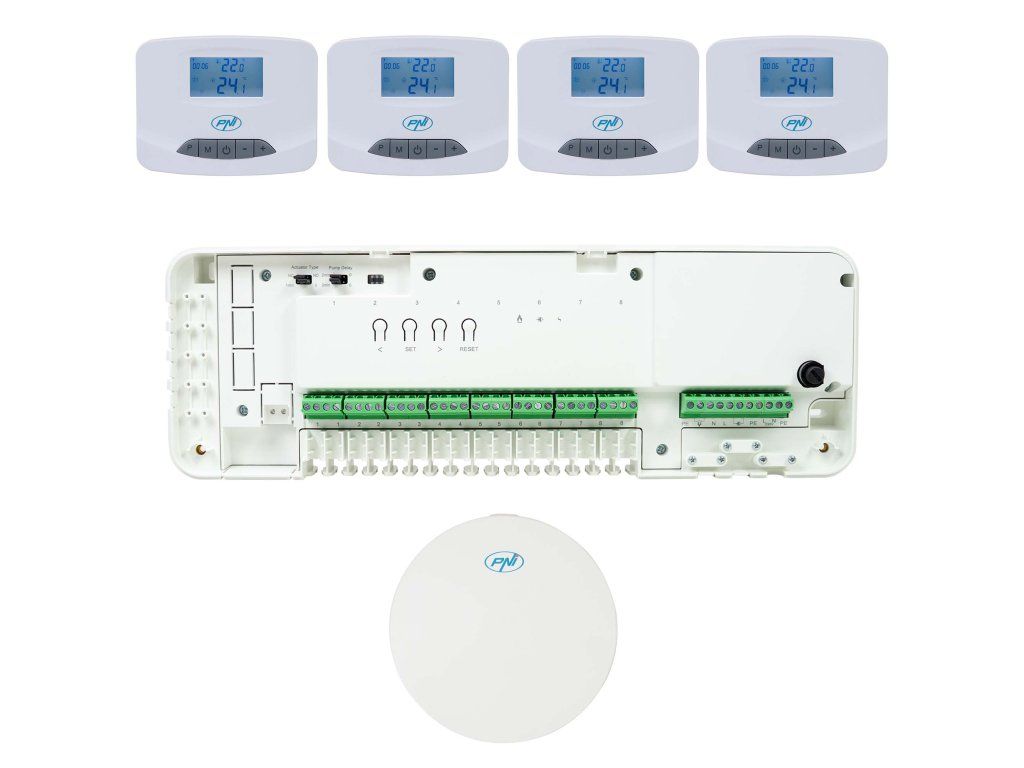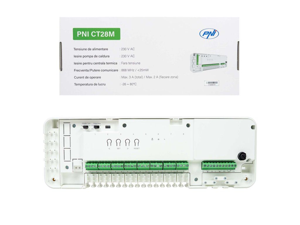- PNI CT28M je řídicí modul (přijímač), který efektivně aktivuje čerpadla nebo solenoidové ventily (až 8 zón). Komunikace s CT28 PRO probíhá bezdrátově; CT28 PRO posílá příkazy do CT28M, které aktivují nebo deaktivují topné zóny. Párování se provádí prostřednictvím vyhrazeného RF protokolu: v modulu se vybere zóna, aktivuje se párování na termostatu a na modulu CT28M a příkaz je rozpoznán rozsvícením LED diody zóny.