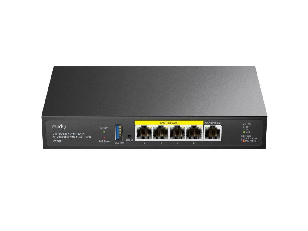 Gigabit router with built-in AP Controller allows easy management of a large mesh network consisting of Cudy Access Points. The device also serves as a 4-port PoE switch with a total PoE budget of 55W and offers flexible power supply via DC jack or passive PoE (24/48V). There is support for a wide range of VPNs and a 1x Gigabit WAN port for reliable internet connectivity. Key Features - 2-in-1 device - AP Controller to manage Cudy AP and router - 4× PoE LAN (802.3af/at), 55 W PoE budget - 1× Gigabit WAN - VPN support (PPTP, L2TP, OpenVPN, WireGuard...) - Power supply DC jack / passive PoE (24/48 V) Package contents - Device - Power adapter - Patch cable - Wall mounting kitAdditional parameters