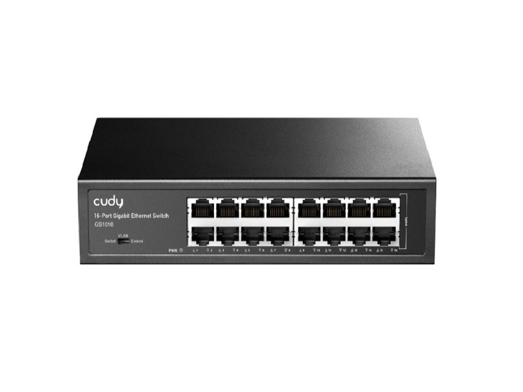 The unmanageable 16-port Gigabit switch in a desktop design can be installed in a 19" rack. This product from Cudy features a durable metal chassis with 19" rack installation, matte black color, low power consumption and easy plug-and-play installation. The switch is ideal for home environments or smaller businesses where an existing network needs to be accelerated from 100 Mbps to Gigabit or expanded to connect more devices such as desktops, printers, IP cameras, smart TVs, gaming consoles and more. This switch features a toggle button (Switch / VLAN / Extend) of which the Switch position is the normal function for data transfer, the VLAN position will prevent devices on ports 1-14 from communicating with each other (only towards ports 15 and 16) and the last position Extend will reduce the line speed on ports 1-14 to 10 Mbps and thus allow reaching a distance of up to 250m, ports 15 and 16 will not be affected. Package contents - Device - Rack mounts - Power cordAdditional parameters
