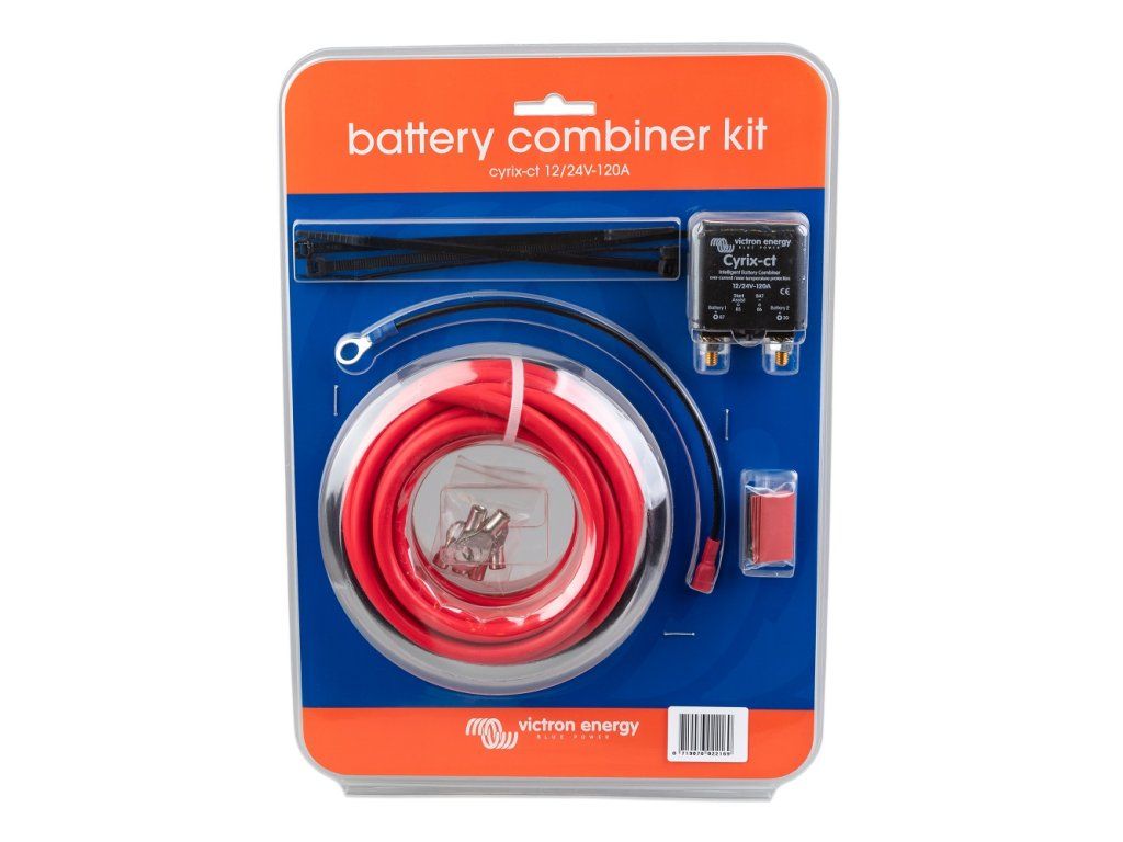 The Cyrix-CT intelligent battery interconnector monitors and controls the charging, disconnection of the starter and service battery. If one of the batteries reaches 13.0 V (26 V) for 10 minutes or 13.8 V (27.6 V) for 4 seconds, Cyrix-ct connects both batteries and charges both batteries simultaneously to full state. When the voltage on either battery drops below 12.8 V (25.6 V) for 10 minutes or 11.8 V (23.6 V) for 4 seconds, the batteries are disconnected from each other. This connection and disconnection works both ways. Batteries may have different capacities, types and designs. Each battery is assumed to power its own appliance. The model is equipped with thermal protection. In the event of high ambient temperature or excessive charging current, it will shut down. As soon as the temperature drops, the Cyrix-ct will automatically activate. Intelligent battery monitoring Some battery jumpers disconnect the battery as soon as they detect a short but strong current. They may also stop working when a large but discharged battery is connected, as the DC voltage immediately jumps below an unacceptable value even though the batteries are connected. The Cyrix-CT software does more than connect and disconnect batteries based on the battery voltage, which it records for a certain fixed time. Cyrix-CT follows the general trend of voltage rise or fall and tries to change the current state only if the voltage trend changes over a certain time. This time depends on the magnitude of the voltage deviation from the voltage trend. It favours the starter battery In a typical system, the alternator is directly connected to the starter battery. The auxiliary battery and all others are connected to the starter battery via a Cyrix CT transfer switch. When the CyrixCT senses that the starter battery has reached the connection voltage, a connection occurs to allow the batteries to charge in parallel. Bi-directional voltage and power from both batteries CyrixCT monitors the voltage of both connected batteries. It will connect them even if the additional battery is being charged by the charger. CyrixCT has dual power supply. It also works even if the voltage of one battery is very low. To avoid unexpected operations during installation or while one battery is disconnected, CyrixCT will not operate if one of the two batteries has a voltage <2V (<4V in a 24V system). Parallel wiring in case of emergency The CyrixCT can also connect batteries at the push of a button. CyrixCT will leave the batteries connected for 30sec. Or manually connect the batteries in parallel. This is useful in an emergency when the starter battery is weak or damaged. The kit includes: 1 x custom Cyrix-ct 1 x 6 metres of 10 mm2 red cable 1 x 0.5 metres of black cable with a cross-sectional area of 10 mm2 1 x 0.2 metres of black cable with a cross-sectional area of 1.5 mm2 with an 8 mm ID hole and a 6.3 mm fastener (connecting output 86 on the Cyrix-ct and the battery) 2 x 8 mm ID eye with insulation 4 x eye with 6 mm inner hole with insulation 4 x black pull-tabs Technical parameters: Operating voltage: 12 or 24 V (self-detection) Maximum alternator current: 150 A Maximum continuous system current: 120 A Current consumption when the device is not switched on: 4 mA Connection voltage (with a delay of approximately 10 minutes): 13 V / 26 V Connection voltage (with a delay of approximately 4 seconds): 13.8 V / 27.6 V Disconnection voltage (with a delay of approximately 10 minutes): 12.8 V / 25.6 V Disconnection voltage (with a delay of approximately 4 seconds): 11.8 V / 23.6 V Disconnection overvoltage: 16 V (32 V) Consumption in case of circuit closure: 220mA (120mA in case of 24V) Dimensions without pins: 45 x 45 x 80 mm Housing material: black plastic Degree of protection: IP54Additional parameters