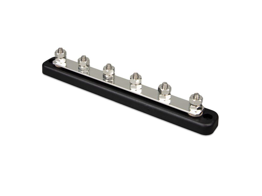 DC Busbars are used to distribute high DC current and at the same time serve as a connection for batteries and/or DC devices. We offer busbars with different current ratings and different numbers of connection terminals. Each busbar is equipped with a removable protective cover. Further technical information and dimensions can be found in the enclosed technical data sheet. A sample diagram for the use of a DC busbar can be found in the download section below. Product parameters: 150 A / 70 V - 6 terminals for connection of high current devices Including coverAdditional parameters