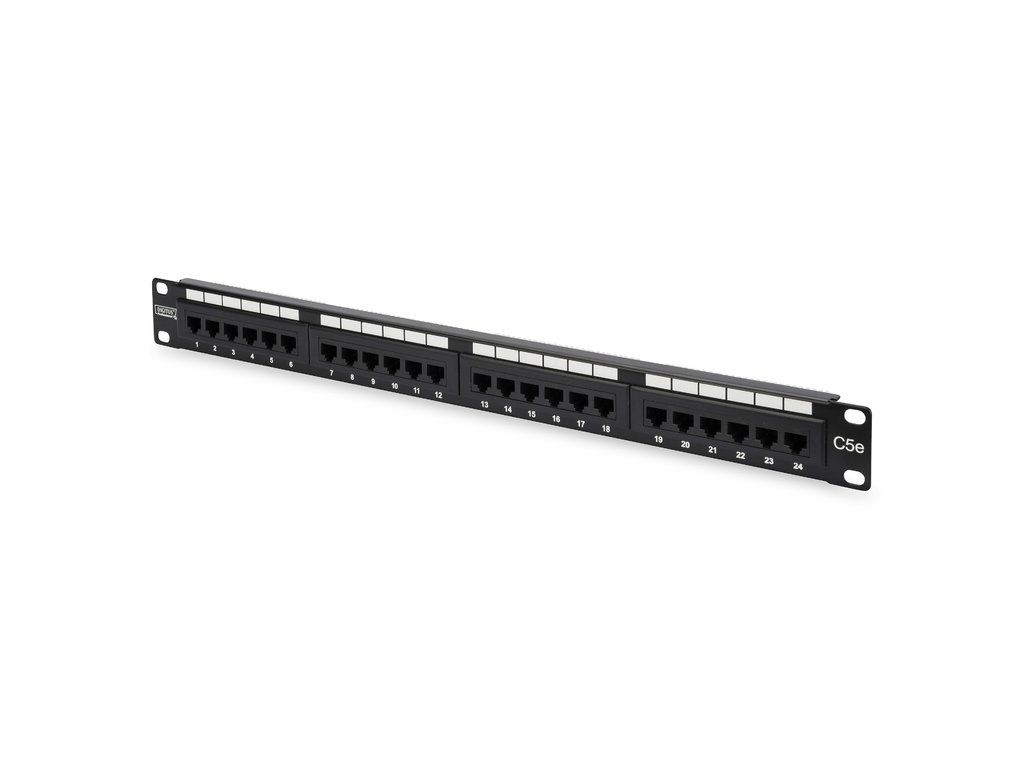 Patch panel Digitus 19'' 24 ports UTP CAT5e, RJ45, black Product parameters: - Cat5e,EN-50173, ISO/IEC 11801 - metal housing and front panel - black color - 24x UTP RJ45, 8P8C - unshielded design - ready for installation in a 19" rack - 1U height - cable installation with LSA tool - color-coded according to EIA/TIA 568 A & B standard Dimensions: - height: 44 mm - width: 483 mm - max depth: 90 mmAdditional parameters