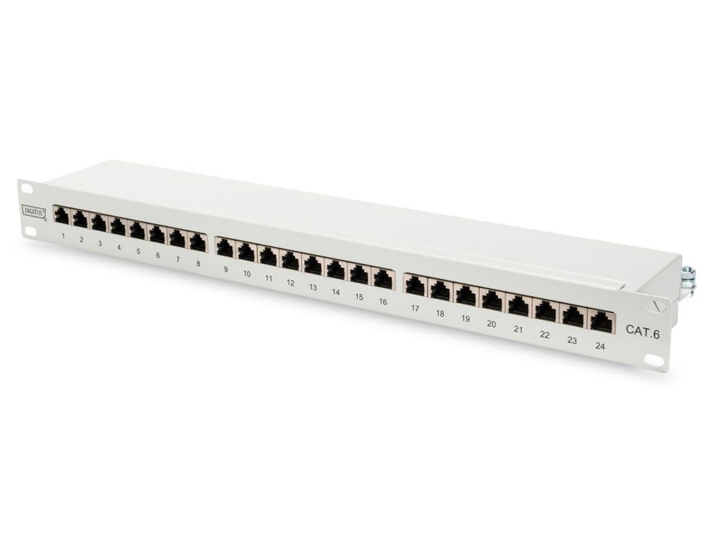 Patch panel CAT 6, shielded, 24 port RJ45, 8P8C, LSA, 1U, rack mountable, grey, - Category 6 transmission characteristics - Scope: Up to 250 MHz, 1GBase-T - ISO/IEC 11801 3rd edition, EN 50173-1, EIA/TIA 568-C - Suitable for 483 mm (19") rack mounting - RJ45 female, 8P8C - Cable installation using LSA strips, colour coded to EIA/TIA 568 A & B - Cable fixing with intelligent cable ties - Central earthing - 360° shield coverage - Housing material: 1.5 mm cold-rolled galvanic steel, possibly according to EN1.4301, UNS S30400, AISI 304 and LMSAD110 - RJ45 female material: ABS UL 94V-0 - RJ45 female contact: tin-plated phosphor bronze, 0.5 µ gold-plated contact - RJ45 shielding: tin plated bronze - LSA end terminal: Krone LSA+, UL 94V-2, zinc plated phosphor bronze - Ground wire: Not included - Conductor plate: FR4, UL 94V-0 - Insert force: 30N max (IEC 60603-7-5) - Retaining force: 7.7 kg between connector and plug - Operating temperature: -20°C to +70°C (ISO/IEC 11801, EN 50173-1, ANSI/TIA/EIA 568 C) - Female mating cycles: > 750 ac. according to ISO/IEC 11801, IEC 60603-7-5 - Clamp: > 200 acc. to ISO/IEC 11801, IEC 60603-7-5 - IDC wire size: 22 - 26 AWG solid and stranded wire - Insulation resistance: > 500 MOhm - Contact resistance: < 20 MiliOhm - Dielectric Strength: 1000 VDC (Contact/Contact), 1500 VDC (Contact/Ground) - Colour: light grey, RAL 7035 - Ports: 24 - Category: CAT 6Additional parameters