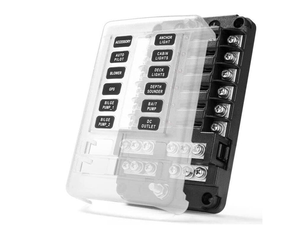 Fuse distribution block with central supply of positive and negative pole and 12 fuses with optical interrupt status control (12× LEDs). Stickers with English names of protected objects also included. - 19×12 fuses are not included ! This knife fuse box with storage for up to 12 standard knife fuses up to a maximum of 30 A per circuit is ideal for automotive, marine, outdoor and domestic applications. Easily identify and immediately replace blown fuses without the guesswork! LED indicator lights up when a blown fuse is detected. It can be installed on cars, RV, bus, yacht, boat, etc. It can be directly connected to the car/boat to any electrical wiring (such as roof lights, car headlights, width lights, fog lights, warning lights, car refrigerators, car chargers, car fans, car TVs, etc.) The fuse holder has good mechanical strength, insulation, heat resistance and flame retardancy. All bus bars and fuse terminals are nickel-plated copper for corrosion resistance and optimum conductivity. All fasteners are stainless steel, the fuse box is inlet, the outlet end is fastened with screw-in screws for faster installation, and the safety box is fastened with self-tapping screws, making installation easier and more secure. Specifications: Material: PC cover + PBT base + tinned copper Size: 138.25*85*36.5mm Input rated voltage: 12v-32V Input rated current: 100A Maximum output current: max 30A per circuit Input wire size: #4-6 AWG Output conductor size: #12-16 AWG Main lead clamp: M5 threaded stud Single conductor clamp: M4 threaded studAdditional parameters