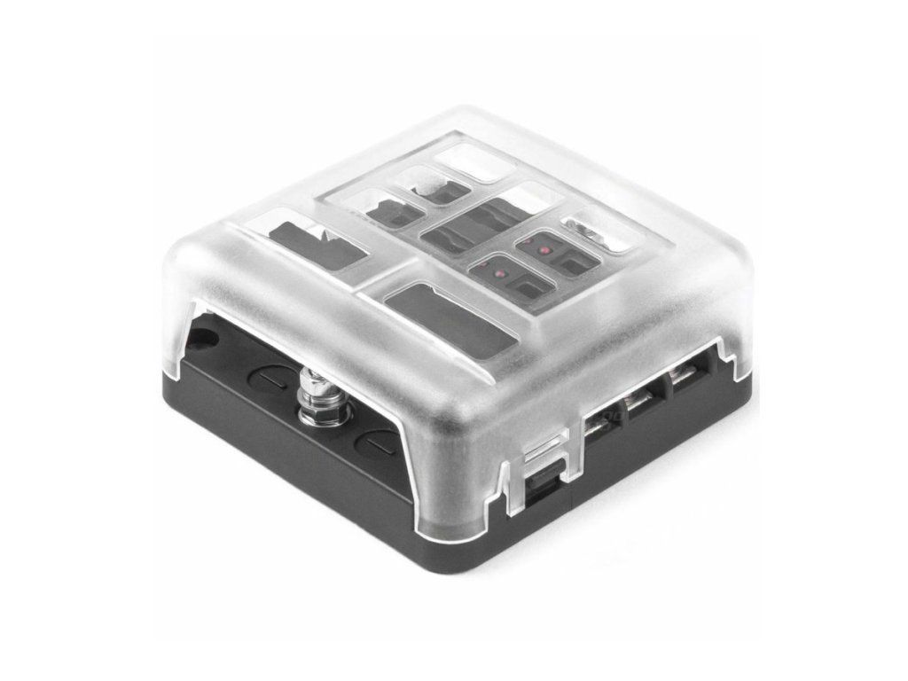 Fuse distribution block with central supply of positive and negative pole and 6 fuses with optical interrupt status control (6× LED). Stickers with English names of protected objects are also included. Storing up to 6 standard knife fuses up to a maximum of 30 A per circuit, this knife fuse box is ideal for automotive, marine, outdoor and domestic applications. Easily identify and immediately replace blown fuses without the guesswork! LED indicator lights up when a blown fuse is detected. It can be installed on cars, RV, bus, yacht, boat, etc. It can be directly connected to the car/boat to any electrical wiring (such as roof lights, car headlights, width lights, fog lights, warning lights, car refrigerators, car chargers, car fans, car TVs, etc.) The fuse holder has good mechanical strength, insulation, heat resistance and flame retardancy. All bus bars and fuse terminals are nickel-plated copper for corrosion resistance and optimum conductivity. All fasteners are stainless steel, the fuse box is inlet, the outlet end is fastened with screw-in screws for faster installation, and the safety box is fastened with self-tapping screws, making installation easier and more secure. Specifications: Material: PC cover + PBT base + tinned copper Size: 88*86*36mm Input rated voltage: 12v-32V Input rated current: 100A Maximum output current: max 30A per circuit Input wire size: #4-6 AWG Output conductor size: #12-16 AWG Main lead clamp: M5 threaded stud Single conductor clamp: M4 threaded studAdditional parameters