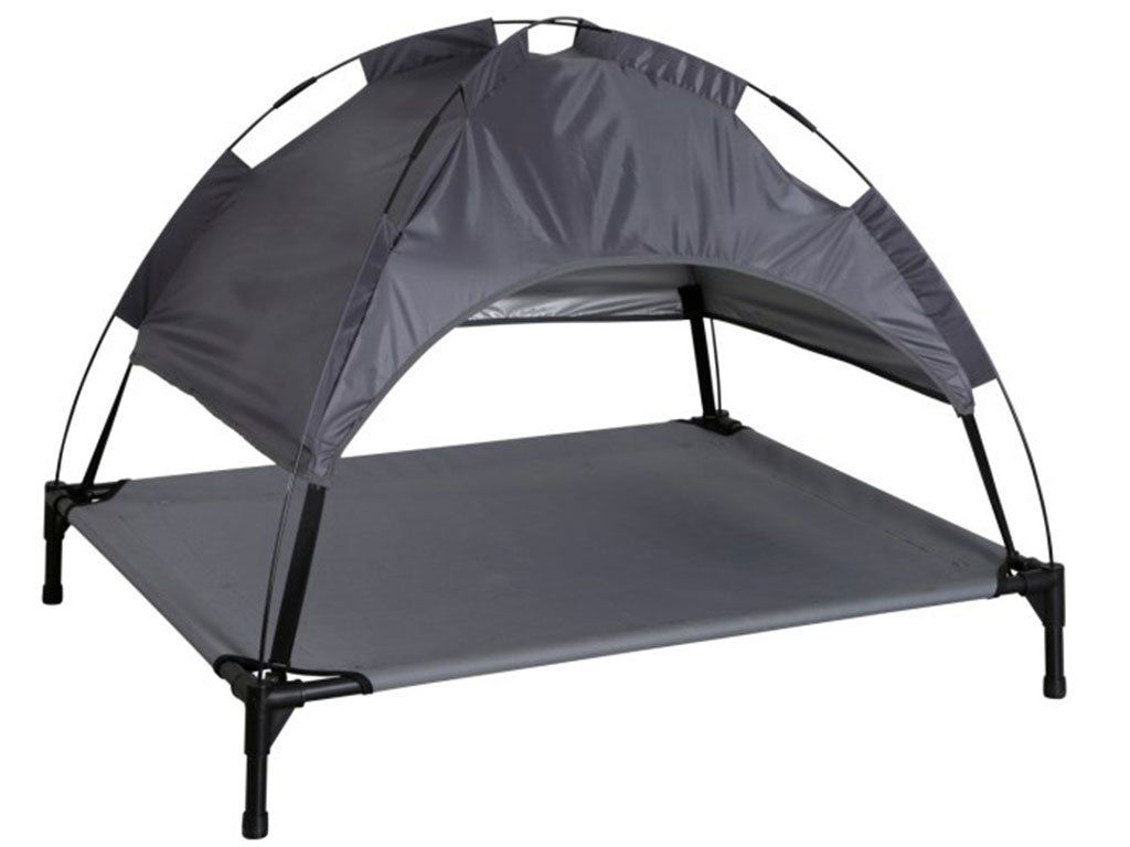 Deckchair for dog, forinterior and exterior, handyfor home and travel, breathable cover wovenOxford, durable uV-resistant, water-repellent, sremovable roof, easy to clean, quick assembly/disassembly, carrying capacity to30 kg, dimensions105 x 86 x 75 cm.
