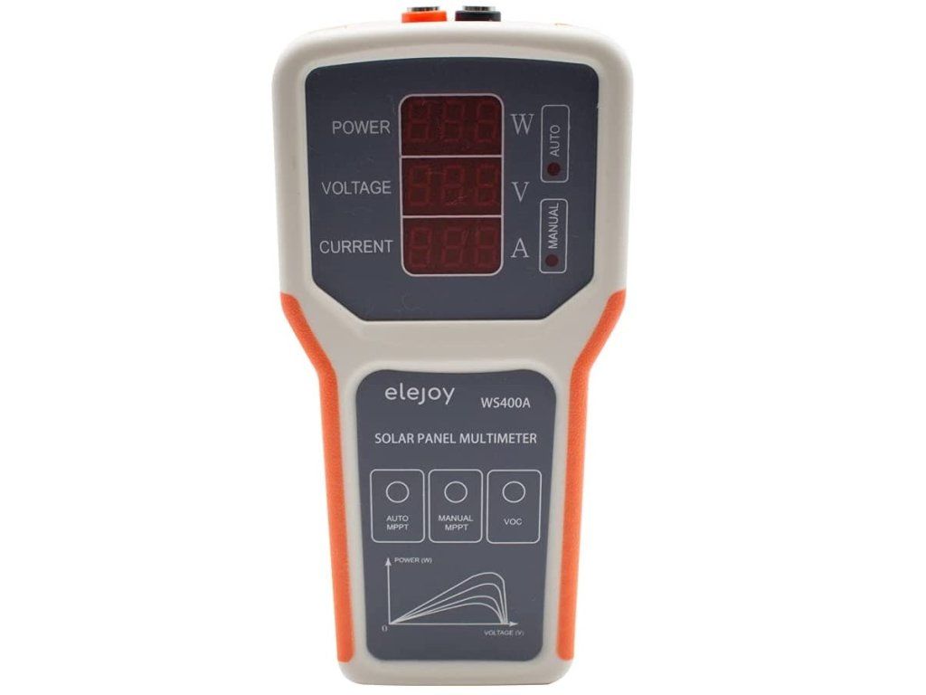 ELEJOY WS400A is a solar photovoltaic panel tester. This solar panel multimeter can test the maximum power point and no-load voltage of a photovoltaic panel Suitable for: Solar panel manufacturer Solar panel distributors Solar panel users Features: AUTO test MPPT Manual MPPT test Protection against overvoltage, overtemperature, overcurrent Over rated power protection No additional power supply required Specifications: Name: solar panel multimeter Display Type: Digital Display Model: WS400A Power: 0.1-400W Voltage: 12-60V Current: 0-20A Power mode: solar panel power supply Packaging: EVA package Material: plastic Dimensions: 165 x 80 x 30 mm Weight: 436 g Operating temperature: 0 - 40 Celsius Cable length: 50 cm NOTE: The multimeter is powered directly from the solar panels without additional batteries. Instructions for use: Automatic MPPT detection: when you press the AUTO MPPT test button, the instrument will automatically adjust the test interval time according to the current power value and reset the digital display. For example, when the solar panel power is 100W, refresh once in 5S, when the power is 300W, refresh once in 15S. Manual MPPT detection: when you press the manual MPPT test button, the instrument starts scanning the maximum power point and refreshes the digital display. Open circuit voltage detection: when you press the VOC test button, the solar panel voltage will be displayed in real time. Multiple protections: over-voltage protection, over-temperature protection, over-current protection and over-rated power protection. Photovoltaic panel power mode, no additional power supply needed, easy to use. Attention: Make sure to use this product within the rated voltage and current range Before testing, make sure to disconnect the PV panel from other equipment or loads Package Contents: 1x multimeter 1 x MC-4 connection cable 1 x alligator cable 1 x EVA ToolkitAdditional parameters