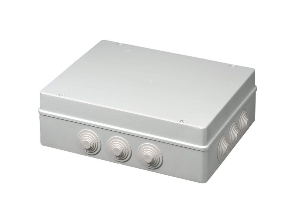 It is a junction box with the ElettroCanali EC400C9 designation and wall mounting. Internal dimensions are 380 x 300 x 120 mm, degree of protection IP55. Technical parameters: Wall mounting Degree of protection: IP55 Weight [kg]: 0.9 Width [mm]: 380 Depth [mm]: 300 Height [mm]: 120 Colour: Grey Rated voltage: 400V Membrane glands, number of holes: 12 Cap: Full, screw-on junction box with stepped gland - Bottom and lid in heat-resistant ABS - Highly durable internal soft rubber gasket - Soft stepped grommets - DIN rail mounting option EN 50022Additional parameters