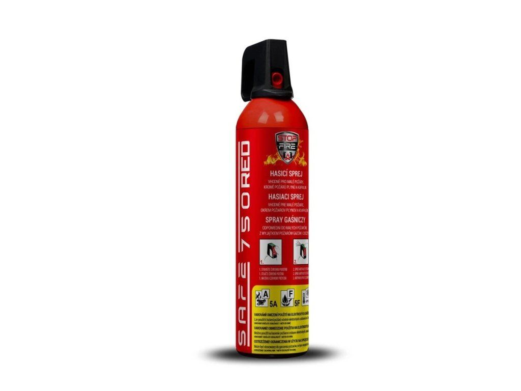With SAFE fire extinguishing sprays, you no longer have to consider which type of extinguishing agent is best suited for a given fire. These innovative sprays represent a real breakthrough in their category - they have been developed in collaboration with leading experts and experienced professional firefighters who know exactly what is key when fighting fires. The basis of SAFE 750 RED is a fluorine-free RM foam concentrate, which, thanks to its consistency, can cope with extreme conditions in temperatures ranging from -20 °C to 50 °C. The sprays are certified according to EN 16856 - Portable fire extinguishing sprays and are suitable for extinguishing various classes of fires. With SAFE products you get a reliable helper for fast and effective protection in every situation. Introducing a revolutionary new product among fire extinguishing sprays - SAFE 750 RED. This versatile fire extinguishing agent is designed to give you fast and reliable protection against fires in a wide variety of situations - whether in the car, workshop, garage, home, office, barbecue or outdoors. SAFE 750 RED allows immediate action at the first sign of a fire and offers extremely effective and versatile extinguishing thanks to modern technology and innovative standards. It is specially developed to safely and effectively tackle the initial fires of these basic classes: A - Solid combustible fires (e.g. wood, paper, textiles, plastics, rubber, coal, straw, etc.) F - Edible oil and grease fires E - Live electrical equipment SAFE 750 RED extinguishing agent is developed and manufactured in the European Union under a valid license exclusively for the SAFE brand. Its higher active ingredient content makes this spray one of the most effective and versatile extinguishing agents on the market. It stands out not only for its effectiveness with minimal consumption, but also for its unique formulation that surpasses the usual standards of conventional extinguishing sprays available on our market. SAFE 750 RED - your assurance of fast and effective fire protection wherever you are. SPRAY BENEFITS: Wide range of applications With SAFE fire extinguishing sprays, you no longer have to worry about whether your chosen extinguishing agent is suitable for a given type of fire. The unique eco-friendly formulation with active ingredients enables safe and effective extinguishing of solids, grease and oil fires. The specially formulated extinguishing agent stream maximises the effectiveness of the extinguishing itself - behind the sprayer it turns into a fine foam aerosol that can absorb large amounts of heat energy generated during combustion. As a result, SAFE offers reliable protection in a variety of situations and contributes to the safety of your home and workplace. No secondary damage Unlike other extinguishing agents, SAFE does not leave minor (spots, stains, ...) or major secondary damage in unaffected areas after use. Reusability Thanks to the constant pressure inside the container, the spray is ready for immediate use at the first pull of the trigger. Extinguishing can be interrupted at any time and resumed as required. The spray remains fully functional until the extinguishing agent is completely empty. Reliable protection in all weather conditions SAFE 750 RED delivers 750 ml of highly effective extinguishing agent with an extinguishing time of up to 25 seconds. Its main advantage is its extreme resistance to temperature extremes - you can safely store and use it in the range from -20 °C to +50 °C. This property makes it one of the unique freeze-resistant extinguishing sprays in its class, which retains full functionality even at significant temperature changes. SAFE 750 RED thus offers a long service life and is the ideal choice for safe storage in a vehicle, for example, even during the cold winter months. Easy to use for everyone The SAFE 750 RED fire extinguishing spray stands out for its compact dimensions and light weight, ensuring that it can be used by everyone from children to the elderly. Handling is intuitive and quick, just like with a conventional spray. Simply remove the red safety catch, approach the fire at a safe distance, point the sprayer at the fire and activate the spray by pressing the green trigger on the spray head. With this simple operation, you can take immediate and effective action in an emergency. Your safety in a fire Have peace of mind with a fire extinguishing spray that is always on hand and ready to intervene in seconds - before a small fire becomes a big danger. Imagine holding a simple but effective solution that can protect your home, your loved ones and your valuable possessions from an unexpected fire. Be prepared to face a fire at its outset and get the sense of security you deserve. With SAFE 750 RED fire extinguishing spray, it's not just a fantasy - it's a reality you can count on. TECHNICAL SPECIFICATIONS SAFE750RED: Fire Classes: A, F and E Extinguishing ability: 5A - Solids 5F - Oils and fats E - Electrical equipment energized up to 1000V Extinguishing agent: RM fluorine-free foam solution Propellant: Nitrogen / N2 Pressure (full): 1.0 MPa at 25 °C Range: 3 - 4 m Extinguishing time: 25 s Extinguishing agent volume: 750 ml Temperature for long-term storage: - 20 °C to +50 °C Weight: 1000 g Dimensions: 74 x 310 mm Environment: Non-toxic and environmentally friendly Certification: EN 16856 We recommend that you also purchase a wall mount for easy placement, which allows you to quickly intervene as soon as a fire starts, thus avoiding the complicated search for the spray and the extension of a small problem into a big one!Additional parameters
