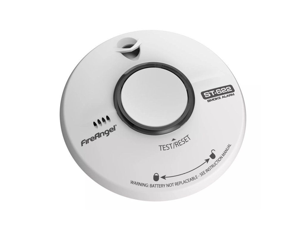 Smoke detector with Thermoptek multi-sensor technology that combines the latest optical chamber measurement with temperature detection. The lifetime of the detector is 10 years including the lithium battery. FireAngel ST-622 smoke detector with 10-year lifetime and built-in lithium battery The FireAngel ST-622 Smoke Detector features Thermoptek multi-sensor technology that combines the latest optical chamber measurement with temperature detection. The detector continuously monitors the ambient temperature and if there is a sharp rise in temperature, it automatically increases the sensitivity of the smoke detection. This reduces the detector's response time by up to 50% compared to conventional smoke detectors. The detector is powered throughout its 10-year life by a built-in lithium battery that is automatically activated when the detector is placed in the mounting bracket. In addition to fire detection, the FireAngel ST-622 has a variety of advanced features. A large test button is used both to verify the functionality of the detector's internal circuitry, integrated siren and battery, and also, as part of the Smart Silence function, to temporarily silence the detector. In the event of a false alarm. The Sleep Easy function allows the alarm to be repeatedly silenced for 8 hours when the battery is low and the Toast Proof function makes the detector highly resistant to false alarms caused by cooking fumes. It can therefore be used without fear even near kitchens where the use of conventional smoke alarms is not recommended. In addition to detecting a fire, the red signal LED and integrated 85dB siren allow you to be alerted to a possible malfunction or low battery. The FireAngel ST-622 is designed in accordance with BS EN14604: 2005. Its simple installation, easy maintenance, high reliability and maintenance-free battery power supply make it suitable for use in all households. The detector can be mounted to the ceiling or wall using the supplied fasteners. The lifetime of the detector is 10 years including the lithium battery. The length of the warranty provided is 5 years. Main features: - Power supply by built-in lithium battery for 10 years - Multi-sensor Thermoptek technology for rapid response to imminent fire hazards - Continuous ambient temperature monitoring of the detector - Toast Proof - high resistance to false alarms - Smart Silence - option to temporarily silence the detector in the event of a false alarm - Sleep Easy - option to repeatedly silence the low battery alarm for 8 hours - Loud 85dB siren and red LED for acoustic and visual signalling - Large integrated test button - Designed in accordance with BS EN14604: 2005 - Fault and low battery indication - 10 year detector life including lithium battery - 5 year warranty - Easy installation and maintenance Technical Specifications: - Power supply: 3V DC, built-in lithium battery - Sensor: Optical measuring chamber + 2x thermistor (Thermoptek technology) - Acoustic signaling: built-in 85 dB siren (1 m distance) - Mounting: ceiling/wall mounted - Operating temperature: 4°C to +38°C - Operating humidity: Up to 90% RH, non-condensing - Storage temperature: -20°C to +60°C - Storage Humidity: Up to 93% RH, non-condensing - Material: ABS, UL94 VO self-extinguishing - Certification: BS EN14604: 2005 - Weight: 155 g - Dimensions: diameter 130 x 34 mm - Warranty: 5 yearsAdditional parameters