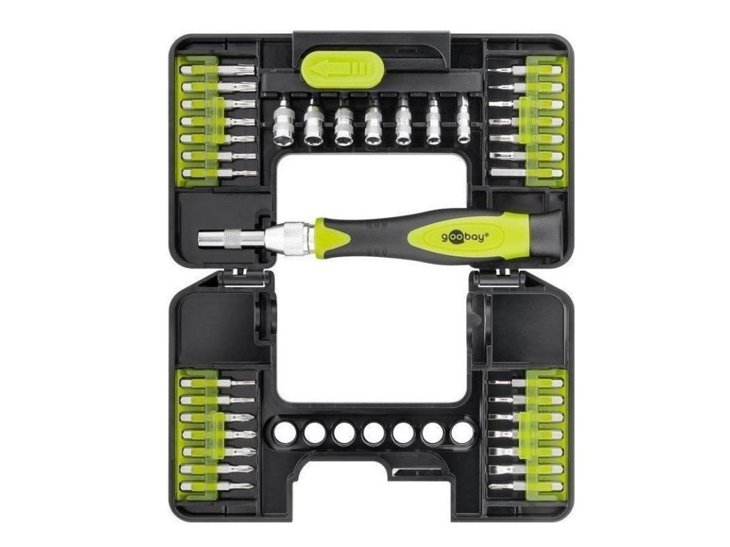 goobay Set of screwdriver and 36 precision bits in box Includes: 6x Flat Heads: 1 mm, 1.5 mm, 2 mm, 2.5 mm, 3 mm, 3.5 mm 4x Phillips tips: PH000, PH00, PH0, PH1 2x Pozidriv: PZ0, PZ1 9x Torx: T4, T5, T6, T7, T8, T9, T10, T15, T20 7x Hex heads: H0.7, H0.9, H1.3, H2, H2.5, H3, H4 1x 100 mm precision bit 7x Hex nuts: 2.5 mm, 3 mm, 3.5 mm, 4 mm, 4.5 mm, 5 mm, 5.5 mm Made of chrome-vanadium steel (CrV) with increased resistance to deformation Stable tips ensure reliable torque transmission and fast fastening Ergonomic handle ensures a comfortable and firm grip when working Non-slip rubberised handle In practical boxAdditional parameters