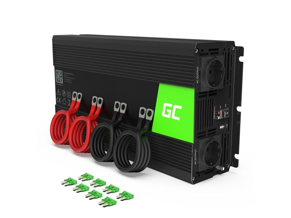 Green Cell® Car Power Inverter from 12V to 230V Pure sine is a device that allows the conversion of DC voltage from a 12V battery to AC voltage 230V. This inverter is capable of providing a constant power output of up to 2000W with a peak power output of up to 4000W. It is a pure sine wave device, which means it provides a stable and quality power supply for your electrical equipment. The Green Cell® Car Power Inverter Converter is suitable for use in cars, caravans, boats or other vehicles that have a 12V battery. You can use it to power a variety of devices such as laptops, cell phones, televisions, refrigerators, lighting and other electronics. You will appreciate the converter not only on your travels, but especially in places where there is no possibility of connecting electricity, whether you are on vacation, a trip or fishing. At first glance, it is already evident that this is a very high quality product. The inverter is safely housed in a black aluminium case. The aluminum case is sturdy and protects the inverter from damage during travel. On the front you will find, in addition to the on/off button, indicators for operating status and possible power supply errors. Mainly, however, there are two 220V type F sockets (without ground pin) and you will also appreciate the USB-A connector for charging your phones, tablets, etc... When charging your phone you will appreciate the QC 3.0 fast charging support. This converter is equipped with overload, overheat and short circuit protection to ensure safe use. It also has two integrated cooling fans that turn on to ensure the converter is at the right temperature and working properly. The fan is powerful but quiet and will definitely not disturb you. The fact that the converter is safe to use is confirmed by the CE and RoHS certifications. The package contains everything you need to use the converter safely. Not only do you find the inverter, quality connection cables for installation directly to the car battery and spare fuses, but also a multilingual manual with CS, SK, DE, HU, RO and other language versions. The Green Cell® Car Power Inverter Converter 12V to 230V 2000W/4000W Pure sine is a reliable and practical voltage converter for powering your electronic devices on the road. Features: - Versatile use - the converter has two 220V sockets, as well as a USB-A port with fast charging support for charging phones and tablets - Safety- over-voltage protection and a range of other protections and certifications - Pure sine wave - also suitable for sensitive devices and appliances e.g.: laptops, power devices, digital clocks, medical devices, TVs etc. - 2× Integrated fan - the temperature of the device is monitored by an intelligent fan. It automatically switches on if the operating temperature exceeds the permissible temperature. Specifications: 85% efficiency Input voltage: 12V DC Output voltage: 230V AC Output frequency: 50Hz Usable power (continuous): 2000W Sine wave type: Pure sine wave Peak power: 4000W Fuse value: 40A Number of fuses: 6 No-load current draw: 1.8A Surge protection: Yes Over-temperature protection: Yes Product code: INV11 Color: Black Dimensions: 332×209×95 mm Dimensions with mounting bracket: 349×209×95 mm Weight: 4721 g Socket type: Schuko Package contents - Voltage converter - 2x connection cables - 6pcs spare 40A fuses - instructions for use CZ/SK/DE/HU/ROAdditional parameters