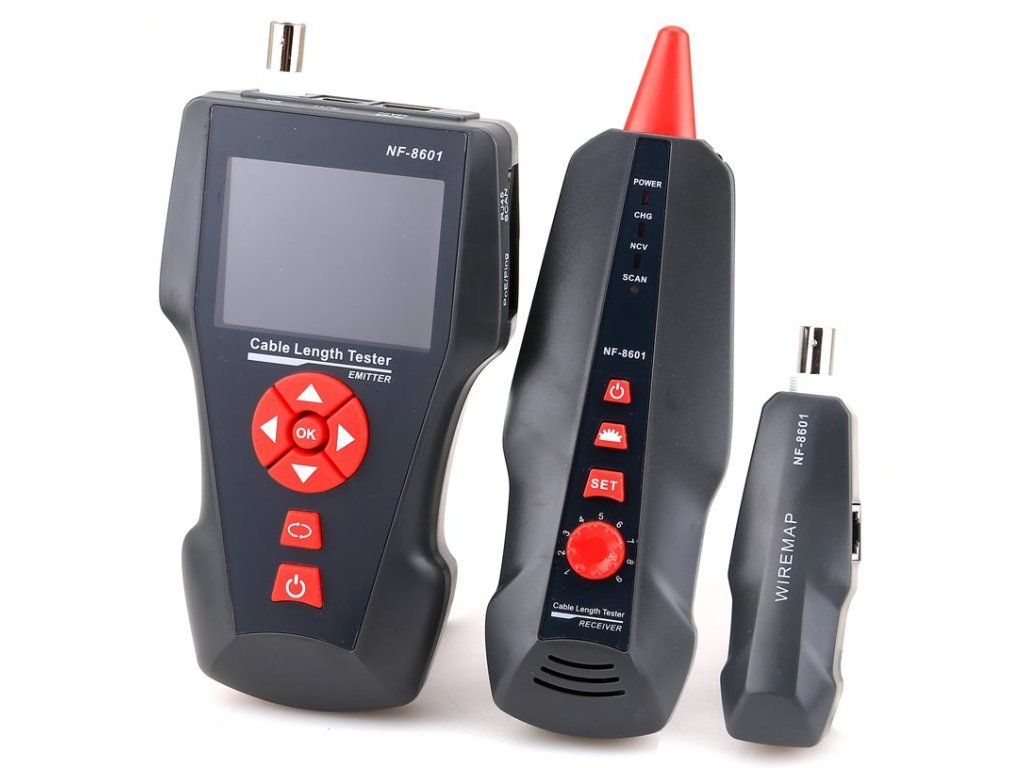 KELUSHI NF-8601 Multifunctional Network Audio Cable Tester with LCD, Lithium Battery (UTP/STP,Cat5e/Cat6,BNC) Functions 1. PoE/PING testing. 2. Track targeted cables among many unknown cables; 3. Fault finding for cable with RJ11 / RJ45 / BNC connectors; 4. Accurately measure cable length. 5. Voltage detection function. 6. Memory and data storage, export or upload data from PC. 7. Lithium battery and color screen Advantages 1. Large LCD color display 320*240 2. Storage and memory function 3. Automatic power on and off 4. Low voltage alarm function 5. Lithium battery for more efficient operation Package contents: 1x main tester (NF-8601-M) 1x Receiver (NF-8601-S) 1x Remote Identifier (NF-8601-R) 1x microUSB charging cable 1x 5v/1A adapter 1x RJ45 test cable 1x RJ11 test cable 1x cable clamps 1x Manual EN Technical parameters: Main tester - parameters Indicator: LCD 320x240 mm, with backlight Cable test types: STP/UTP 5E,6E network , telephone , coaxial cable. Max. wiremap distance: 2000 m Max. tracking distance: 2000m Max. cable length distance: 1000m Max. calibration distance: 10m Accuracy: 3% ( after calibration ) Compatible connectors: RJ11,RJ45,Coaxial, PING/POE,BNC Cable Map Indication: LCD (#1-#8) Battery Type: 3.7V lithium battery 1800mAh Dimensions: 173x92x34mm Receiver - parameters Cable test types: RJ11,RJ45, BNC Cable types: 2 cores Battery type: 3.7V lithium battery 1800mAh Dimensions: 183x58x35mm Remote Identifier - Parameters Connector types: RJ11,RJ45, BNC Dimensions: 106x32x30mmAdditional parameters