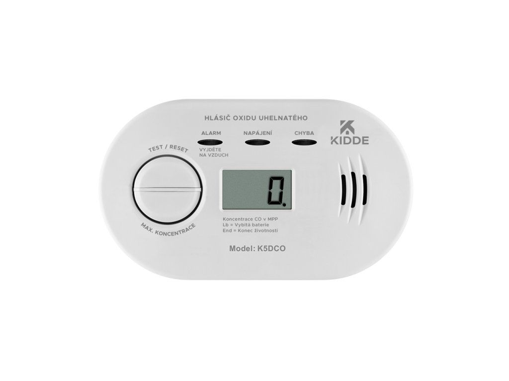 A CO detector with an electrochemical sensor that detects carbon monoxide (CO) and is equipped with an LCD display. The device is powered by 2pcs of alkaline 1.5V AA batteries, which are included in the package. An economical solution and low purchase price with an electrochemical sensor and a 7-year warranty, this is the Kidde K5DCO carbon monoxide (CO) detector that continuously monitors the presence of poisonous carbon monoxide in homes or businesses, providing protection from its deadly effects. In addition to a trio of monitoring LED indicators, it also has an LCD display that continuously displays CO readings and other status information. The detector can be mounted securely on a wall or simply placed loose on a table, shelf or other horizontal surface for convenience. It is an ideal safety feature and reliable protection against this silent killer not only for the home, but also in rented accommodation or on holiday. By approval, it complies with the latest CSN -EN50291:2018 standards for home carbon monoxide detectors. The K5DCO toxic CO gas leak detector features a sensor with a 7 year warranty and a 10 year lifetime. Its operating time is thus much longer than that of most conventional CO alarms commonly offered on our market. After 10 years of protection, the device will announce the end of its life and pass on the information that it needs to be replaced. Carbon monoxide detector with LCD display - Model Kidde K5DCO Kidde's products in the CO detection category meet the latest and most demanding criteria of the CSN -EN50291-1:2018 standard and it is no coincidence that they are among the world's top safety products, relied upon for many years by the general public and professionals around the world. The K5DCO carbon monoxide detector with display is equipped with a second-generation electrochemical sensor, guaranteeing the durability and operability of the device for up to 10 years. The battery power supply using two AA alkaline batteries (included) allows the detector to be installed in the optimum location in the interior space, providing permanent protection against this silent killer. The built-in LCD display shows carbon monoxide concentration levels from 0 to 999 ppm*. The device measures the deadly hazard of carbon monoxide (CO) at one-second intervals. Exceeding the permitted CO level is indicated visually (by a red LED indicator) and acoustically (by a loud, pulsating 85dB audible alarm). Kidde carbon monoxide detectors are equipped with two push buttons: - TEST / RESET, which is used to test and verify the correct functioning of the device and to reset it - MAX.CONCENTRATION, which is used to display the highest CO level measured since the device memory was reset. The status of the sensor, batteries and internal circuitry is automatically monitored by a microprocessor controlled safety system. In case of detection of a malfunction, any operating anomaly or low capacity of the power batteries, this condition will be indicated visually by a yellow LED indicator with the display of the corresponding information on the LCD display, accompanied by an appropriate alarm acoustic signal. In addition, the Kidde K5DCO detector is equipped with a simulation test function to quickly check the correct response of the CO sensor to the test gas. Thanks to the special design, it is not necessary to install the device firmly on a wall in the room, but it is also possible to freely place the detector on flat surfaces such as a bedside table, shelf, etc. Carbon monoxide is a colourless, tasteless and odourless gas that is produced by the misfiring of fossil fuels such as coal, oil, natural gas, LPG and wood. It can also be produced by poorly maintained or faulty fuel-burning appliances used for domestic heating, such as: boilers, gas appliances, karmas, barbecues, blocked chimneys, ventilation systems or damaged flue pipes. Common symptoms of CO poisoning include headaches, nausea, fatigue or muscle pain - but these can easily be confused with a diagnosis of flu. It is therefore important to protect your family and home with carbon monoxide detectors. Testing the Kidde K5DCO detector The best way to test and maintain a CO detector sensor in working order is through a test kit with SAFE 400 calibration gas. This test gas verifies that the detector's circuitry and systems are operating reliably and that the CO sensor is actively responding to the appropriate level of carbon monoxide concentration. Advantages of the device - Kidde electrochemical technology - second-generation sensors, the most accurate electrochemical sensors in the world, take measurements at one-second intervals - Longer sensor lifetime than other manufacturers on the market - LCD display with a maximum range of 999 ppm - Loud 85 dB alarm signaling - TEST / RESET function - reset, test and verify proper operation of the device - MAX.CONCENTRATION function - to display the highest measured CO level in the device memory - Battery power supply via 2pcs of replaceable AA batteries - Wall or free standing installation on a flat surface - End-of-life indication - Low operating costs, small size and weight - Easy installation and handling - Timeless and modern design - 7-year warranty (does not apply to power batteries) Carbon monoxide detection device with certification confirming compliance with the requirements of the Czech technical standard ČSN-EN EN50291-1:2018 for home carbon monoxide detectors. Compliance with this standard has been confirmed by the independent research laboratory of the British Standard Institute (BSI). *for concentrations in the range 0 - 30 ppm, the marking is "0". Product specifications - Sensor technology: electrochemical Kidde technology - patent pending, one of the most accurate technologies in the world. - Sensor lifetime: 10 years - Power supply: DC; two 1.5 V alkaline AA batteries (included) - Mounting method: on the wall (screws and dowels included) or free on a flat surface. - Acoustic a