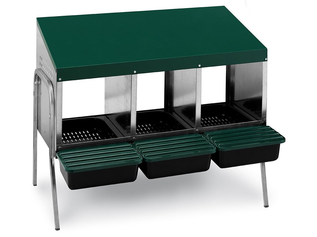 Znáškovej hniezdo pre sliepky so zberným košíkom na vajcia trojmistne na nožičkách, kapacita až 15 nosníc (5 nosníc na jednu kukaň), dno hniezda je spádované, vajcia sa samo odkotúľa do zberného košíka, vyrobené z pozinkovaného kovu s plastovým dnom, farba zelená. Hniezdo môžete jednoducho postaviť v kuríne na zem, veľmi ľahká údržba čistoty, rozmery: 83,7 cm dĺžka x 52 cm šírka x 66,5 cm výška.