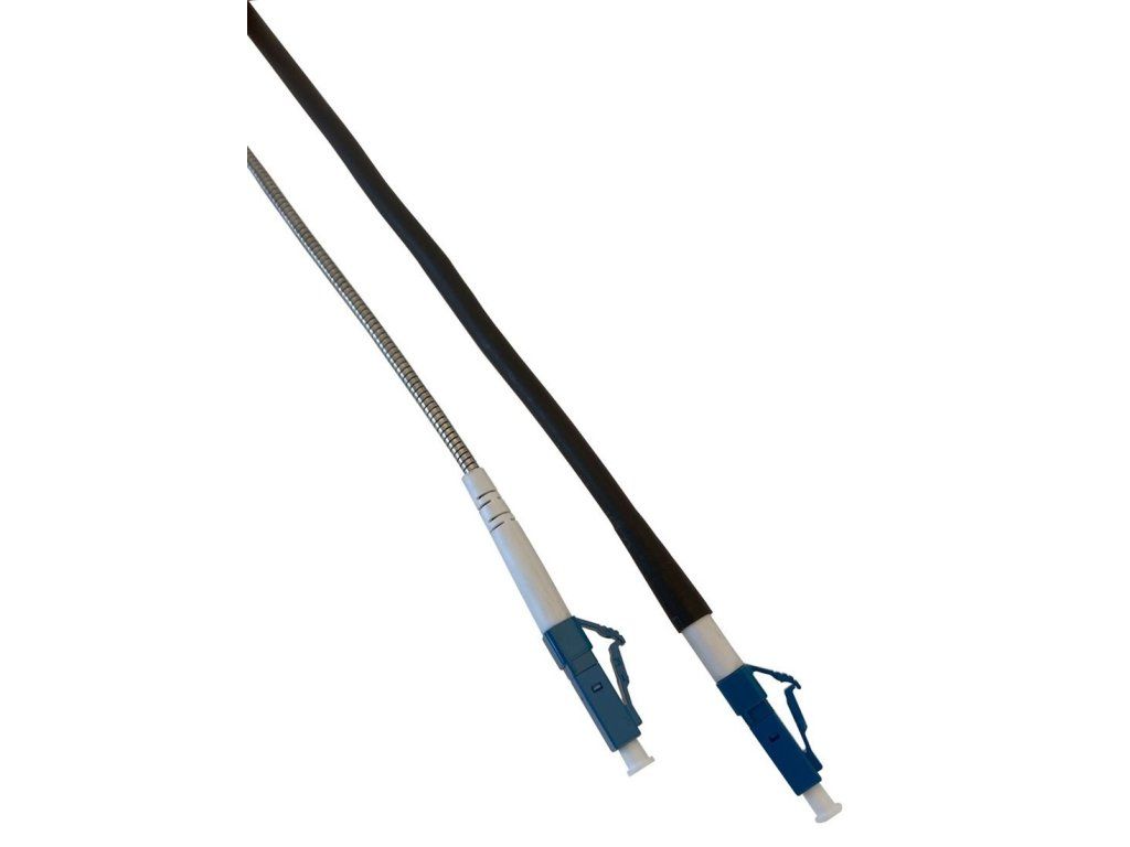Masterlan optical outdoor patch cord suitable for outdoor installations, for example to connect a wireless linker that has an optical port and a data cabinet. The cable jacket is made of high quality UV resistant material. Inside the cable there are two aramid tensile elements along with one SM fiber, which is fitted with a metal flexible neck along its entire length to prevent damage during less than gentle handling. On one side, the PE protection is tightened all the way to the connector and on the opposite side, the end is PE-free to guarantee higher flexibility. Singlemode 9/125 fibre type G.657.A2 is used and is terminated with one LC connector on both sides with UPC grinding. The length of the whole cable is 20m.Additional parameters