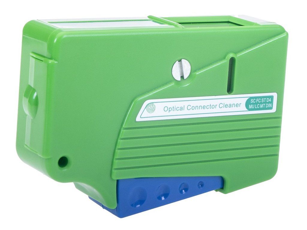 Cleaning cartridge for cleaning optical connector ferrules, compatible with SC, LC, FC, ST, E2000, MPO female and other connectors. The high-density, anti-static textile fiber cleaning tape is sufficient for 500 alcohol-free cleanings (contains no liquid substances). Instructions for use - press the button to rotate the cleaning tape and lightly run the ferule of the connector over the tape several times. Technical parameters: Physical characteristics Width [mm]:125 Height [mm]:85 Depth [mm]:35Additional parameters