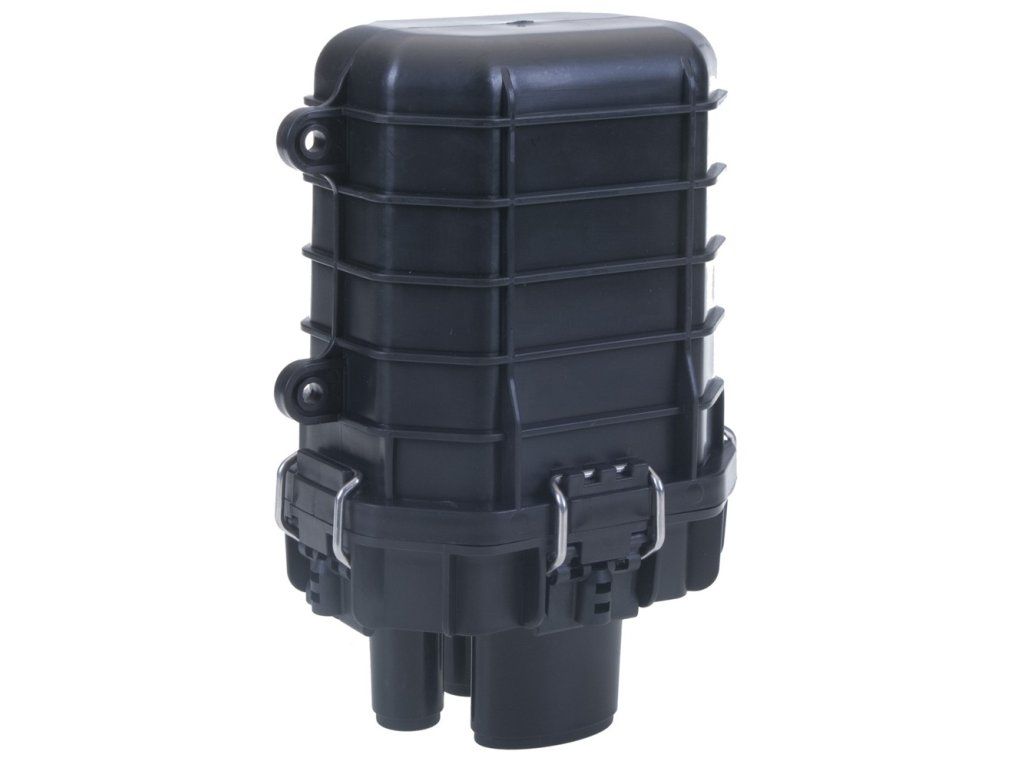 IP68 outdoor fiber optic connector designed for connecting fiber optic cables with up to (48) fibers in (4) built-in cassettes. Heat shrinkable shrink tubing and pull-tabs included. Specifications: Physical characteristics - Degree of protection:IP68 - Material:Polypropylene - Width [mm]:147 - Height [mm]:208 - Depth [mm]:104 - Colour:BlackAdditional parameters