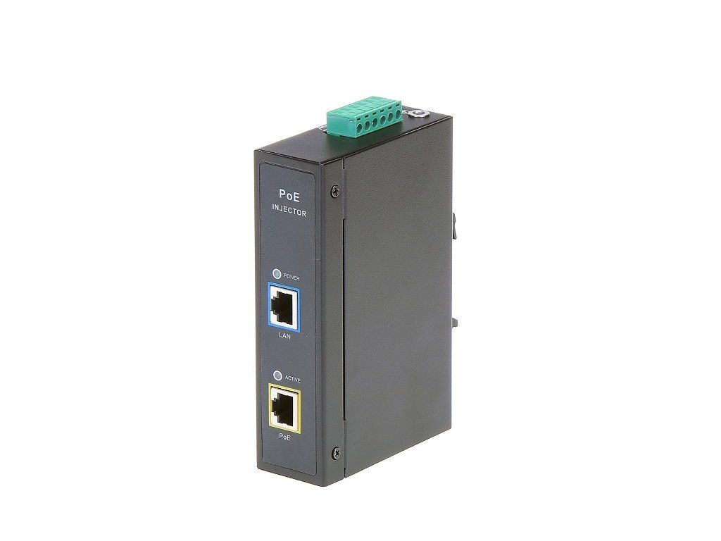 The MaxLink MAXPIDIN30 is a DIN rail mounted active PoE injector with 12 to 48V DC input power and a built-in voltage converter. The output of this power supply is a Gigabit port with 802.3af/at PoE (55V) support for WiFi, VoIP or wireless links. PoE is distributed over pins 4,5(+) and 7,8(-). The second Gigabit LAN serves as a data input. The total power of the power supply is 30W. The power supply has the advantage of 6kV (10/700us) surge protection. This PoE injector is suitable for locations where you already have a central power source - either a solar panel or a strong power source. Technical parameters Product Type Physical characteristics Operating temperature [°C]: -40 to 65 Weight [g]: 400 Depth [mm]: 75 Width [mm]: 32 Height [mm]: 115 Connectors and interfaces Ethernet speed [Mbps]: 10/100/1000 Gigabit LAN: Yes Power Power on pins: 4.5 (+), 7.8 (-) Output Power - 1port [W]: 30 LED indication: Yes Supported PoE-Out standards: 802.3af, 802.3at Number of PoE Out ports: 1 Output Voltage [V]: 55Additional parameters
