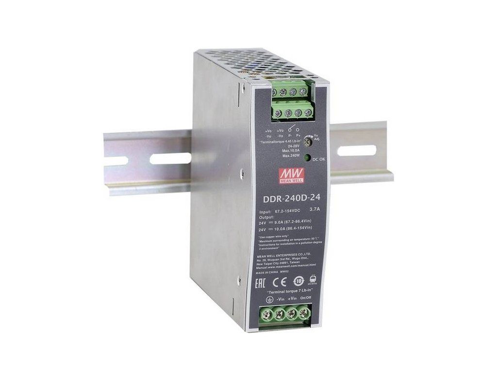 MEANWELL DDR-240 series of DC/DC converters for DIN rail Single Output, input voltage ratio 2:1 power: 240 W Special features For DIN rail mounting. - Can be installed on TS-35/7.5 or 15 DIN rail - Width only 40 mm - Input voltage range 2:1 - 150% of maximum load - Adjustable voltage output - Cooling due to free air convection - Insulation voltage between input and output 4000V - Protection This text has been machine translated. Characteristics Can be installed on DIN rail TS-35/7.5 or 15 Width only 40 mm input voltage range 2:1 150% peak load capacity regulated output voltage cooling due to free air convection isolation voltage between input and output 4000V Protection: short circuit, overload, overvoltage, overheating, input reverse polarity, input under voltage protection Technical parameters Input Voltage See 33.6. Recital of the decision of the company S 67,2V/DC Output current (max) 5A Output current (max.) - rounded 5A Number of outputs 1x Dimensions (l x w x h) 40 x 113.5 x 125.2 mm Weight 760g H 125.2mm Length 40mm Width 113.5mm Connection clamp Output Type (Power Supplies) Adjustable Features DC/DC converter, stabilized , adjustable output voltage Manufacturer ID DDR-240C-48 Type DDR-240C-48 MTBF 484900h Rated input voltage 48 V/DC Efficiency 92% Input voltage (max) 67.2V/DC Input voltage (min.) 33.6V/DC Operating Temperature (max.) +70°C Operating temperature (min.) -40°C Output voltage (max.) 56V/DC Output voltage (min.) 48V/DC Output voltage (max.) 48V/DC Power 240W Output voltage 48V/DC Product Category DC/DC voltage converter for DIN railAdditional parameters