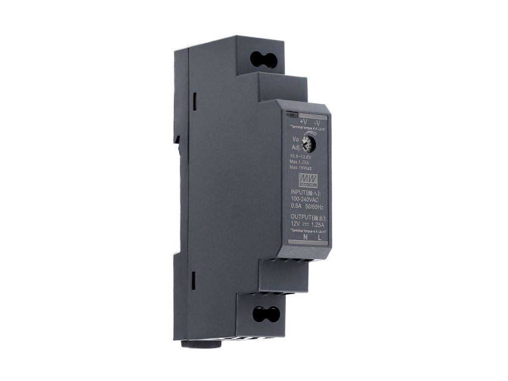 DIN rail power supply, Innovated model series DR-x-x, smaller dimensions. Suitable for use in industrial and home control systems, building automation, factory automation and electromechanical instruments. All HDR series power supplies are manufactured in circuit breaker design - suitable for shallow enclosures, e.g. in domestic wiring. The high quality all-plastic body meets the Class II product standard (double insulated without earth terminal). The insulation strength of 3 kV ensures a high level of safety. Only reliable components with resistance to high temperatures, such as Japanese capacitors with a lifetime of over 10,000 hours at 105 °C, are fitted in the power supply. Power: 15W Output voltage: 12V Output current: 1.25A Universal input: 85~264VAC, 120~370VDC Ultra-thin design with a width of 17.5mm Idle power consumption < 0.3W Insulation Class II LPS Passive cooling Adjustable DC output voltage Designed for TS-35/7.5 or 15 DIN rail LED operation indicator Efficiency: 85% Operating temperature: -30 ~ +70°C MTBF: 1166K hrs. Dimensions: 17.5 x 90 x 54.5mm Weight: 78g Protection types: anti-short circuit, overload, surge protectionAdditional parameters