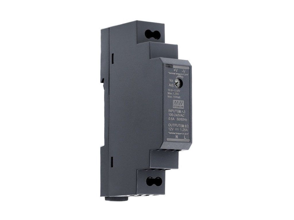 DIN rail power supply, Innovated model series DR-x-x, smaller dimensions. Suitable for use in industrial and home control systems, building automation, factory automation and electromechanical instruments. Power: 15.4W Output voltage: 48V Output current: 0.32A Universal input: 85~264VAC, 120~370VDC Ultra-thin design with a width of 17.5mm Idle power consumption < 0.3W Insulation Class II LPS Passive cooling Adjustable DC output voltage Designed for TS-35/7.5 or 15 DIN rail LED operation indicator Efficiency: 87% Operating temperature: -30 ~ +70°C MTBF: 1166K hrs. Dimensions: 17.5 x 90 x 54.5mm Weight: 78g Protection types: anti-short circuit, overload, surge protectionAdditional parameters