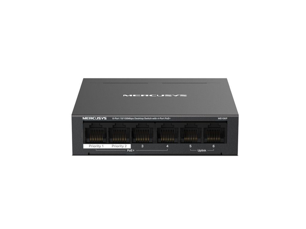 MS106P is a 6-port 10/100 Mbps switch with 4 PoE+ ports. The device is ideal for IP surveillance in small and medium-sized businesses. Plug-and-play allows for easy deployment. Key Features - (6) Port: (4) 10/100 Mbps PoE+ port + (2) 100Mbps port - PoE+: up to 30W PoE per port and 67W for all together - (2) Uplink port: The MS110CMP has 2 uplink ports when enabled in isolation mode. One for connection to the internet and the other for connection to the NVR. - PoE up to 250m: PoE up to 250m in "extend" mode - Isolation mode: Isolation mode allows for one-click isolation of client traffic - IEEE 802.3af/at PoE+: af/at PoE+ power - Plug and Play: Easy to use - PoE Auto-Restore: Automatically restarts failed or unresponsive PoE-powered devices - Metal Chassis: Ideal for heat dissipation and longer life Package Contents - Device - Power Adapter - Quick Installation GuideAdditional parameters