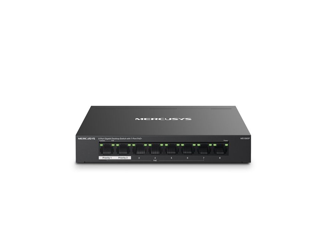 The MS108GP is an 8 port full Gigabit POE switch in a desktop design. The switch supports 802.3af/at standards with a maximum power of 30W/port and has a total POE budget of 65W on 7 ports. Prioritizing the first two ports ensures error-free operation of powered devices prone to error-free data transmission, such as voice or video. Thanks to a mechanical switch on the back, it can be switched to Extend mode. where the maximum range is extended up to 250m, depending on the cable quality and power consumption of the powered device. Extend mode can be activated either for ports 1-4 only or for all 7 POE ports The link speed is automatically reduced to 10Mbps in this mode. The metal chassis ensures optimal cooling and long switch life. Key features - 8× 10/100/1000 Mbps RJ45 ports (7x POE) - Data transmission and power supply in a single cable - Support POE 802.3af/at, 30W/port, total budget 65W - Range up to 250m in Extend mode, port isolation - Metal chassis for greater durability, better cooling and longer life - Plug & play Package contents Device 53.5V/1.31A power adapter Quick installation guideAdditional parameters