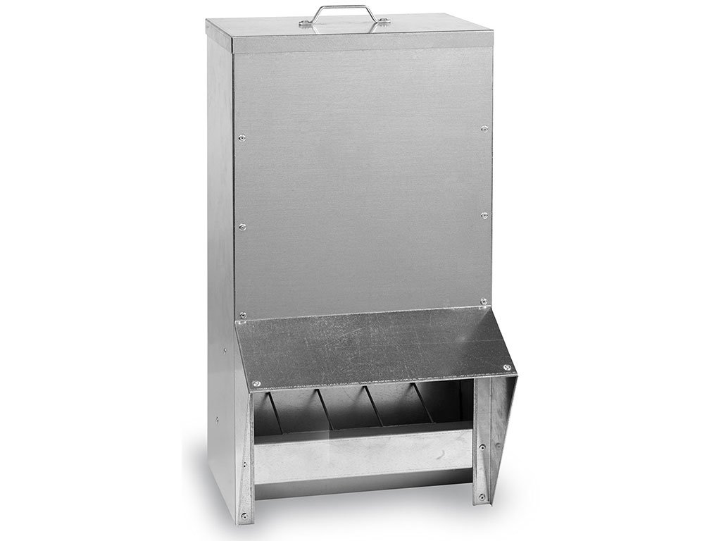 Hopper feed, for hens and other poultry, kapacita40 litres, up to 100 hens, galvanized, easy maintenance, dimensions:310x330x620 mm.