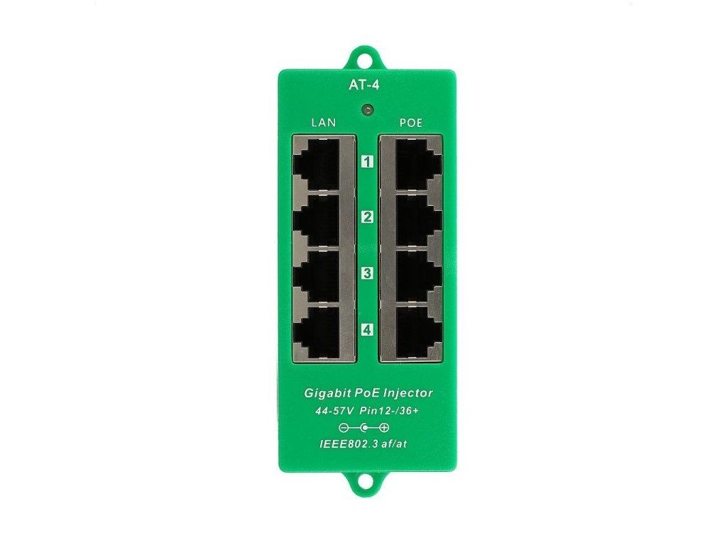 Panel integrating four gigabit POE injectors with a power range of 44-57V and a maximum current of 550mA/port with support for 802.3af/at. Universal solution for remote power supply of multiple active elements with integrated extractor over UTP cabling. Power input via standard 2.1mm power jack. Adding this pass-through panel to the rack gives you a power center that simply plugs between an existing switch and a patchpanel that already leads to the powered device (IP camera, IP phone, wireless elements, etc.). Power pairs: 3.6 (positive pole) / 1.2 (negative pole) Interface: 4x shielded RJ45 connector for connection to LAN (Data) 4x shielded RJ45 connector for merged output (Data+Power) LED indication: Power OFF -- no signaling 4/5 (V+),7/8 (V-) -- green The power supply is not included, the choice and power parameters of the power supply must be optimized according to the respective power consumption of the powered elements and their configuration. Technical specifications: Input : 44-57V DC 2.1MM Output : 44-57V (max 550mA per port) Data: 1/2&3/6&4/5&7/8 Power: 3/6 & 1/2 Data In :Connects PC/HUB/Switch Weight : 70g Dimensions : 115mm×45mm×25mm Ethernet : TIA/EIA 568 Cat. 5 Data rate : 10/100/1000Mbps 802.3af/at standard Connector type : RJ-45 Operating temperature range : 0°C ~ +50°C Storage temperature range : 0°C ~ +50°C Humidity (operating) : 10% ~ 80% RH Humidity (storage) :5% ~ 90% RH Certification : CE , FCCAdditional parameters