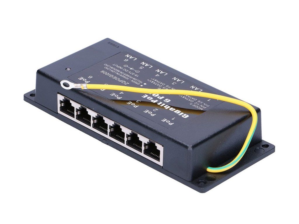Panel integrating 6 gigabit shielded passive POE injectors. Universal solution for remote power supply of multiple active elements with integrated extractor over UTP cabling. Over-current protection up to 650mA (+/-15%) on each port, grounding element. LED indication of current values: red: current draw on ports below 400mA / green: current draw on ports 400mA - 650mA Power input via 2.1mm jacks for two diversified power modes in A and B modes. Adding this pass-through panel to your rack gives you a power center that simply plugs in between your existing switch and the patchpanel that already leads to the powered device (IP camera, IP phone, wireless elements, etc.). - Dimensions: 150mm x 65mm x 26mm - Current protection up to 650mA (+/-15%) on each port - Grounding conducted by green-yellow ground wire - Mode A - minus on pins 1-2, plus on pins 3-6 - Mode B - minus on pins 7-8, plus on pins 4-5 - Supported supply range 18 to 57 V Power supply via Mode B Mikrotik, Ubiquiti, or similar 24V devices supporting Mode B power (pins 4/5+ and pins 7/8-) Power supply via Mode A IP cameras - 48v (802.3af PoE) IP Phones - 48v (802.3af PoE) WiFi APs - Aruba, Cisco, HP, Siklu and other devices supporting Mode A power (pins 1/2- and pins 3/6+) Power supply is not included, power supply selection and performance parameters should be optimized according to the respective power consumption of the powered devices and their configuration. Technical specifications: Input: 24-48V (2.1 power jack) Data: 1/2 & 3/6 & 4/5 & 7/8 Power: according to the selected A/B mode Standards: passive PoE, 802.3af / 802.3at Ethernet: TIA/EIA 568 Cat. 5 Data rate: 10/100/1000Mbps Connectors: 6x shielded GB RJ-45 Operating Temperature: 0°C ~ 40°C Storage Temperature: -40°C ~ +70°C Operating Humidity: 10% ~ 80%RH Storage Humidity: 5% ~ 90%RH Certifications: CEAdditional parameters