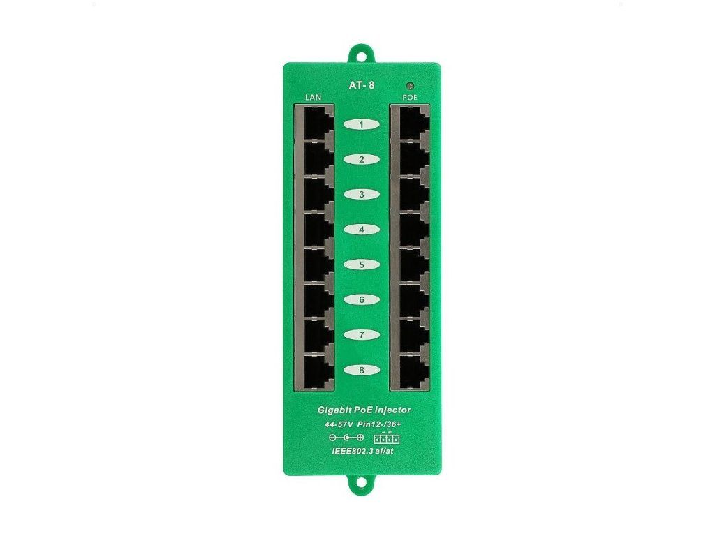 Panel integrating eight gigabit POE injectors with a power range of 44-57V and a maximum current of 550mA/port with 802.3af/at support. Universal solution for remote power supply of multiple active elements with integrated extractor over UTP cabling. Power input via standard 2.1mm power jack or via panel connector with terminal block. By adding this pass-through panel to the rack, you get a power center that simply plugs in between an existing switch and a patchpanel that already leads to the powered device (IP camera, IP phone, wireless elements, etc.). Power pairs: 3.6 (positive pole) / 1.2 (negative pole) Interface: 8x shielded RJ45 connector for LAN (Data) connection 8x shielded RJ45 connector for merged output (Data+Power) LED indication: Power OFF -- no signaling 4/5 (V+),7/8 (V-) -- green 4/5 (V-),7/8 (V+) -- red The power supply is not included in the scope of delivery, the choice and power parameters of the power supply must be optimized according to the respective power consumption of the powered elements and their configuration. Technical specifications: Input : 44-57V DC 2.1MM Output : 44-57V (max 550mA per port) Data: 1/2&3/6&4/5&7/8 Power: 3/6 & 1/2 Data In :Connects PC/HUB/Switch Weight : 200g Dimensions : 180mm×62mm×25mm Ethernet : TIA/EIA 568 Cat. 5 Data rate : 10/100/1000Mbps 802.3af/at standard Connector type : RJ-45 Operating temperature range : 0°C ~ +50°C Storage temperature range : 0°C ~ +50°C Humidity (operating) : 10% ~ 80% RHAdditional parameters
