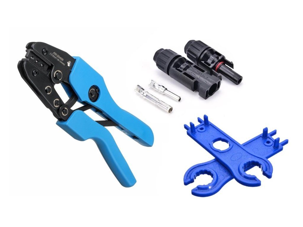 The MHPower small tool kit for crimping MC4 solar connectors contains everything you need for basic installation of solar systems. In the kit you will find crimping pliers, a pair of MC4 connectors and a mounting wrench. INCLUDES: 1x AN-2546B crimping pliers for MC3 and MC4 solar connectors - 2.5/4/6 mm2 1x Sunpulse MC4 solar connectors 2.5 to 6mm2 for photovoltaic panels, (1pair) 1x Wrench for MC4 solar connectors (1pair) - If you need more MC4 connectors, you can buy them separately. The item is listed above, related items.Additional parameters