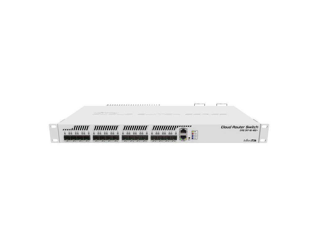 The CRS317-1G-16S+RM is a brand new Cloud Router Switch with L3 features and 19" rack mount. The switch is equipped with 16x SFP+ ports at 10Gbps with backward compatibility for 1Gbps modules, as well as a gigabit Ethernet port for management and one serial port. The CRS317-1G-16S+RM is powered by a new generation of chips that gives high enough performance for all sixteen 10G ports when used with any size Ethernet frame. New features such as hardware spanning-tree protocol or Link Aggregation (LACP) will provide your network with sufficient protection, reliability and raise the level to a truly professional level. In addition to the 2 fully redundant power supplies, the switch also has a large passive cooling system that is assisted by a pair of fans in case of a warm environment. Key Features Choice of operating system - RouterOS or SwOS Non-blocking Layer 2 switching capacity 16K host table IEEE 802.1Q VLAN Up to 4K simultaneous VLANs Port isolation and Port security MSTP HW MPLS forwarding coming in future software update Support for SFP 1.25 and SFP+ 10Gbit modules 800 MHz dual core CPU Dual power supplies Broadcast storm control Port mirroring of ingress/egress traffic Rapid Spanning Tree Protocol (RSTP) Link Aggregation (LACP) Access Control List MikroTik neighbor discovery SNMP v2/v3 Rackmount and tabletop Wide temperature range -20 to +60 C Passive cooling with two backup fans Package contents - Device - Rack mounts - 2x Power cordAdditional parameters