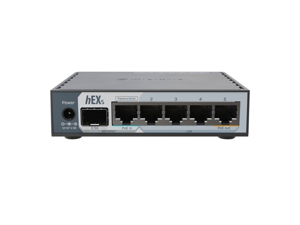 The MikroTik hEX S is a compact, powerful and affordable wired router that is the ideal choice for smart homes or smaller offices. The device offers 5 Gigabit ETH ports, with Ether1 supporting PoE-in and Ether5 PoE-out, allowing additional devices to be powered directly from the router. The output voltage at the PoE-out port matches the router's input power. The main advantage, however, is the 2.5G SFP port, which allows the full potential of fast connectivity - for example, to a NAS server or a provider's optical network. The router can be powered via a 12-57V DC connector, via PoE-in in the range of 18-57V or 802.3af/at. Great hardware and software Inside is a dual-core ARM processor clocked at 950 MHz and 512 MB of RAM, providing plenty of power for more demanding tasks. The RouterOS v7 operating system opens up options such as VLANs, bonding, traffic shaping, advanced routing and other features without the need to purchase licenses or feature extensions. Package Contents - Device - 24V / 1.2A power adapterAdditional parameters
